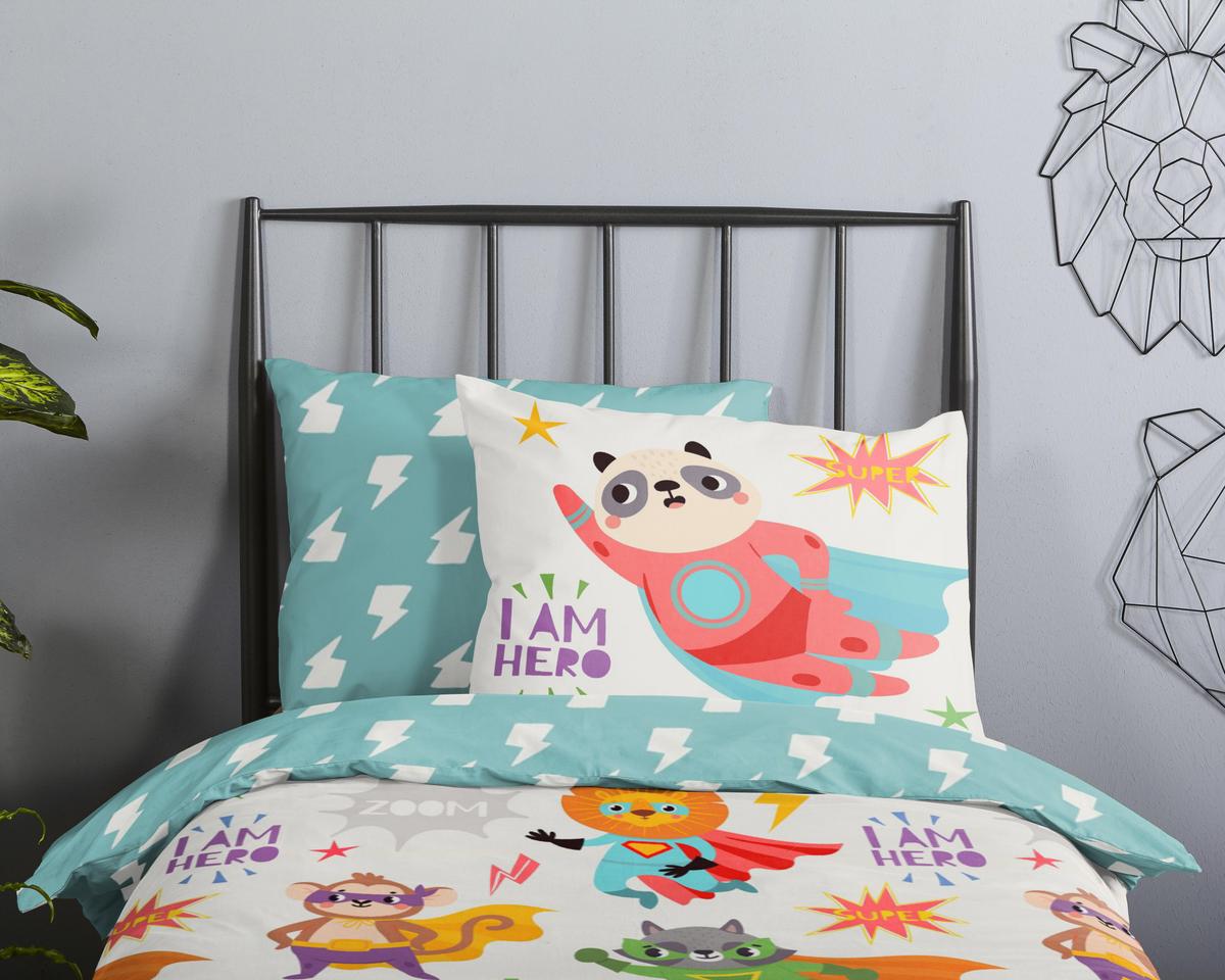 Duik in de wereld van dierlijke superhelden met ons SUPERHERO dekbedovertrek! Met een stoere print van allerlei dieren als superhelden aan de ene kant en bliksemschichten aan de achterkant, brengt dit overtrek een flinke dosis avontuur naar de kinderkamer.