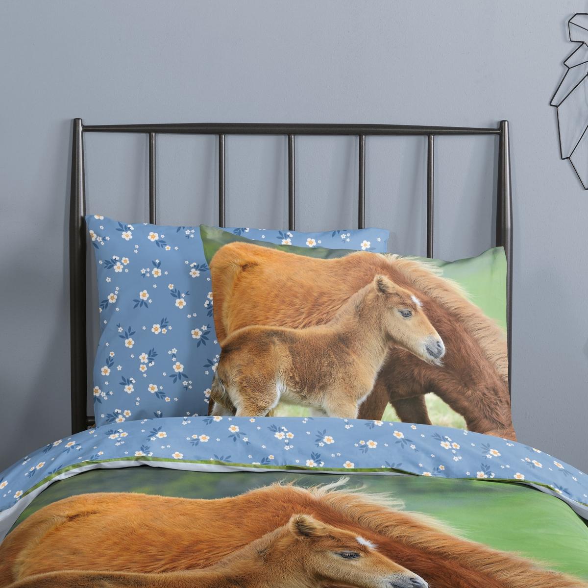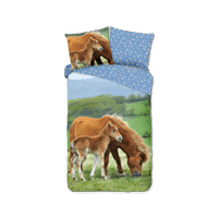 Het REGINE kinderdekbed, met zijn afmeting van 140x220 cm, brengt een vleugje natuurlijke schoonheid en vrolijkheid naar elke kinderkamer. Met een levendig ontwerp van twee paarden die grazen in een weide, roept dit dekbed een gevoel van rust en sereniteit op.