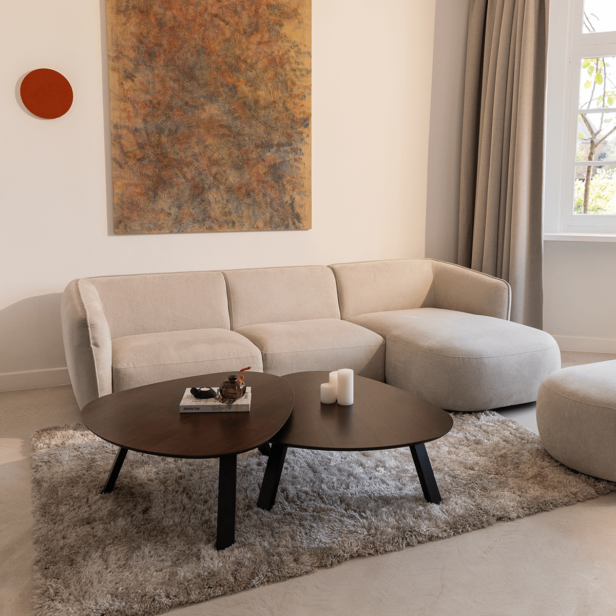 De PALMERA salontafelset, uitgevoerd in donker hout met zwarte poten, voegt een speelse touch toe aan elke woonkamer. De tafels verschillen in grootte – de grootste meet 95x39x85 cm en de kleinere 95x34x85 cm – wat zorgt voor een dynamisch geheel dat perfect in elkaar schuift, maar ook apart geplaatst kan worden voor een luchtig effect.