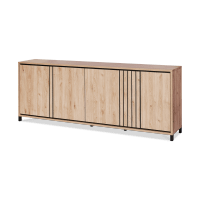Het dressoir JORINA is een stijlvolle toevoeging aan je interieur, waarin functionaliteit en modern design samenkomen. De warme houtlook in combinatie met verfijnde zwarte accenten en subtiele verticale lijnen geven dit dressoir een eigentijdse en luxueuze uitstraling.