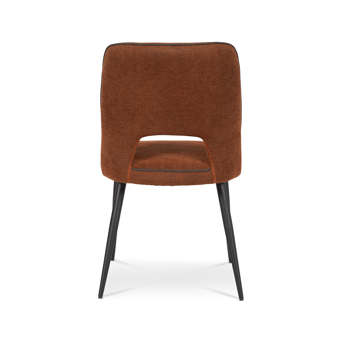 Maak kennis met stoel ALICE, met de koperkleurige stoffen bekleding en slanke zwarte metalen poten straalt Alice tijdloze elegantie uit, terwijl haar afgeronde rugleuning een ongeëvenaard niveau van comfort biedt. De opening aan de onderkant van de rugleuning voegt een subtiel, maar leuk detail toe, waardoor niet alleen een luchtige uitstraling ontstaat, maar ook een verhoogde mate van comfort en gemak bij langdurig zitten.