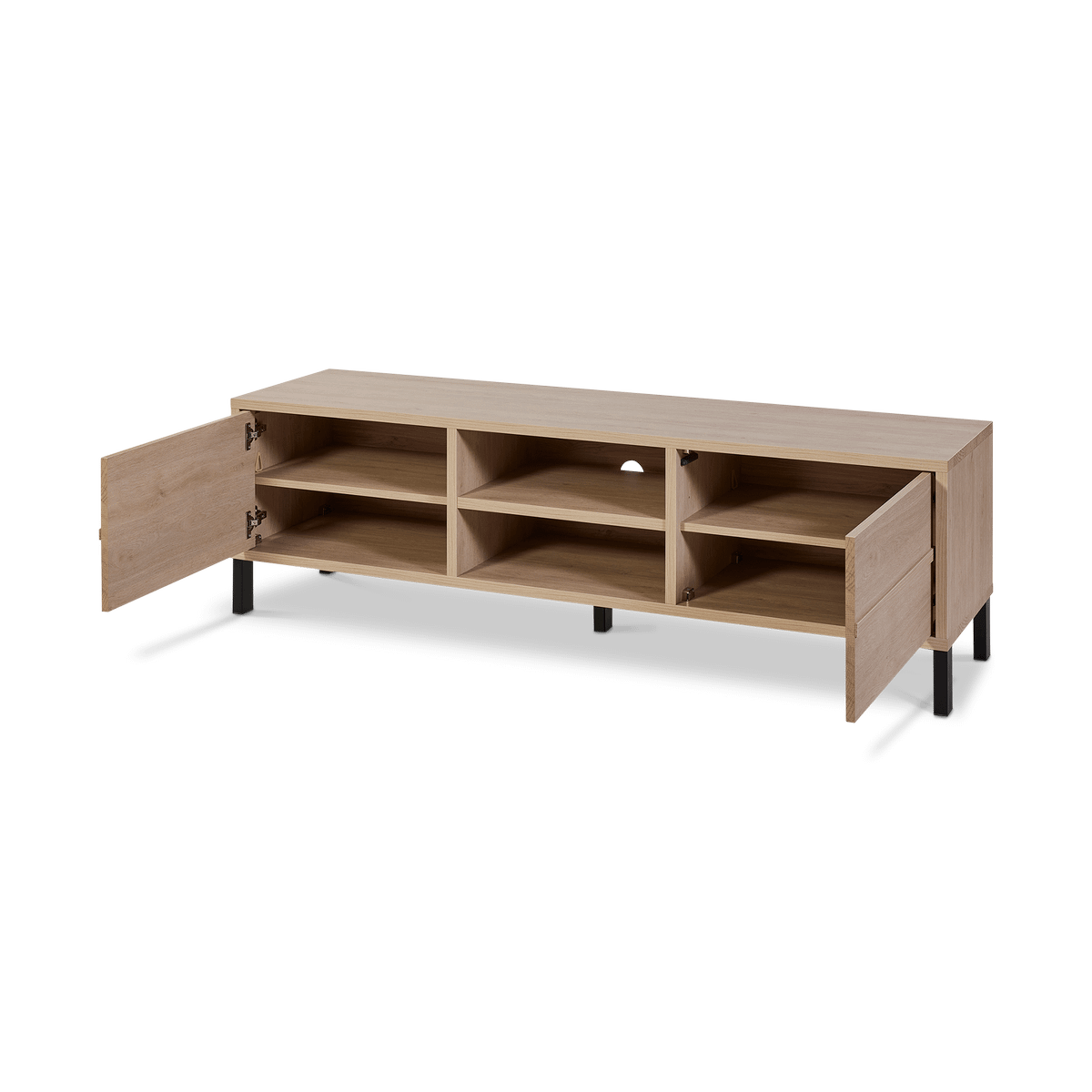 Het meubel beschikt over twee deuren en een open vak met kabeldoorvoer, ideaal voor het netjes opbergen van multimediatoestellen en accessoires. De zwarte metalen poten zorgen voor een elegante, luchtige afwerking en een subtiel industrieel accent.