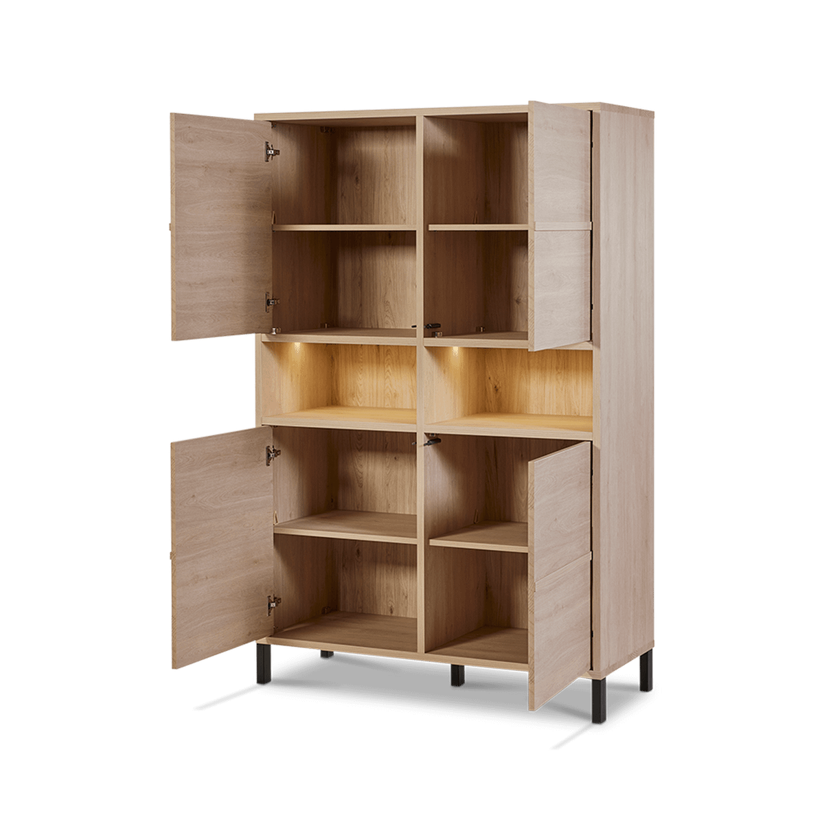 Het open middenvak met geïntegreerde LED-verlichting zorgt voor een sfeervol accent en benadrukt je mooiste decorstukken of glazen. De zwarte, slanke poten geven het meubel een luchtig karakter en een stijlvolle industriële toets.