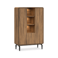 Barkast NESTOR met 3 deuren in de afwerking Walnoot/Elegant Zwart brengt een harmonieus samenspel van stijl en functionaliteit in je interieur. De warme walnoothouten uitstraling straalt verfijning uit, terwijl de subtiele zwarte accenten en afgeronde hoeken het design een eigentijdse touch geven. De slanke metalen poten zorgen voor een luchtige uitstraling en geven de kast een moderne, zwevende look. Achter de greeploze deuren biedt deze barkast voldoende opbergruimte voor glazen, flessen en accessoires, waardoor je altijd alles binnen handbereik hebt. In de verlichte nissen zet je favoriete items in de kijker. Combineer met andere artikelen uit de NESTOR collectie voor een harmonieus geheel!