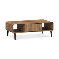 Salontafel NESTOR met 2 nissen en een lade in het midden in de afwerking Walnoot/Elegant Zwart combineert verfijnde esthetiek met functioneel design. De warme walnoothouten uitstraling zorgt voor een tijdloze en stijlvolle look, terwijl de afgeronde hoeken en subtiele zwarte accenten een moderne touch geven. De open nissen bieden een luchtige opbergmogelijkheid voor boeken en decoratie, terwijl de centrale lade zorgt voor een opgeruimd interieur. De slanke metalen poten geven de tafel een elegante, zwevende uitstraling. Combineer met andere artikelen uit de NESTOR collectie voor een harmonieus geheel en een sfeervolle woonkamer!