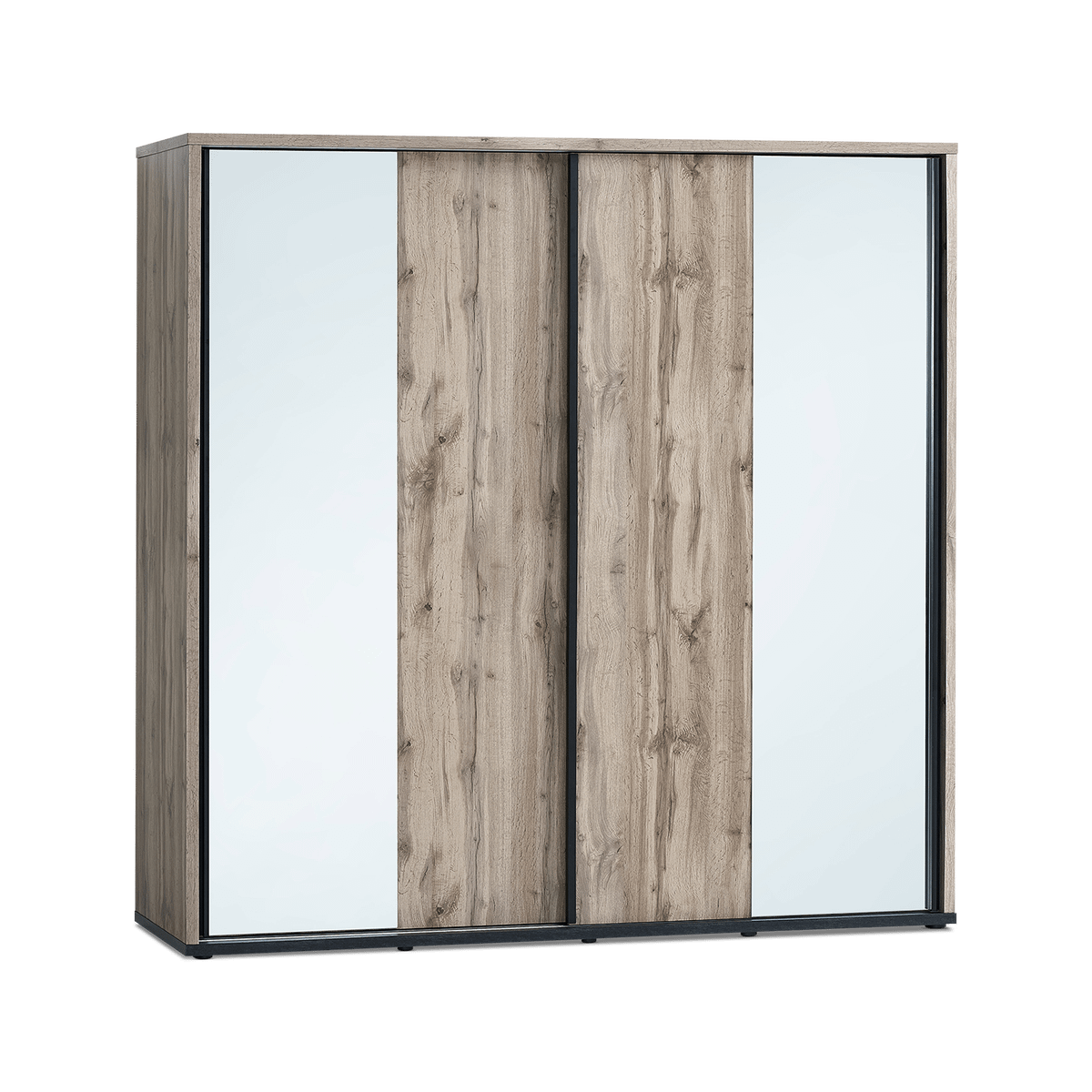 De ruime schuifdeurkast combineert functionaliteit met stijl, waarbij de mix van houtdecor en lichte panelen zorgt voor een visueel luchtig effect. Dankzij de doordachte indeling biedt deze kast voldoende opbergruimte zonder in te boeten op esthetiek.