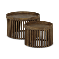 Deze stijlvolle salontafelset met prachtige houtstructuur van massief mangohout en spijlen, haalt meteen een Zuiderse sfeer naar boven. De tafelbladen zijn afneembaar wat betekent dat je hier bijvoorbeeld plaids in kan opbergen. Handig toch?