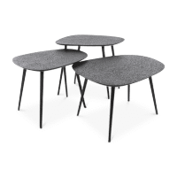 De set van drie salontafels INAYA stralen, met hun unieke afgeronde vierhoekige vorm, moderniteit en verfijning uit. De drie verschillende groottes bieden veelzijdigheid in gebruik. Plaats ze naast elkaar voor een groter oppervlak of apart voor meer flexibiliteit in de opstelling van je woonkamer. De INAYA tafels kunnen dienen als handige plekken om drankjes, snacks, boeken, of decoratieve items zoals bloemenvazen te plaatsen.