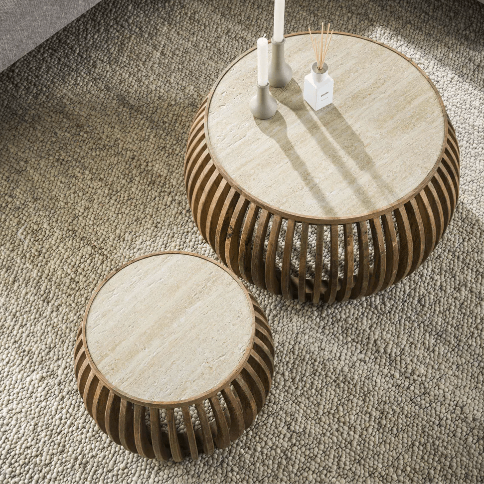 Het ronde ontwerp en de luchtige constructie zorgen voor een lichte, organische uitstraling die perfect past binnen moderne, Scandinavische of bohemian interieurs. Dankzij het speelse formaatverschil kun je de tafels samen plaatsen of apart gebruiken — als salontafel, bijzettafel of decoratief accent.