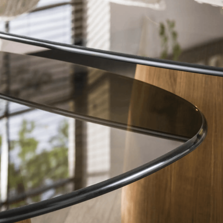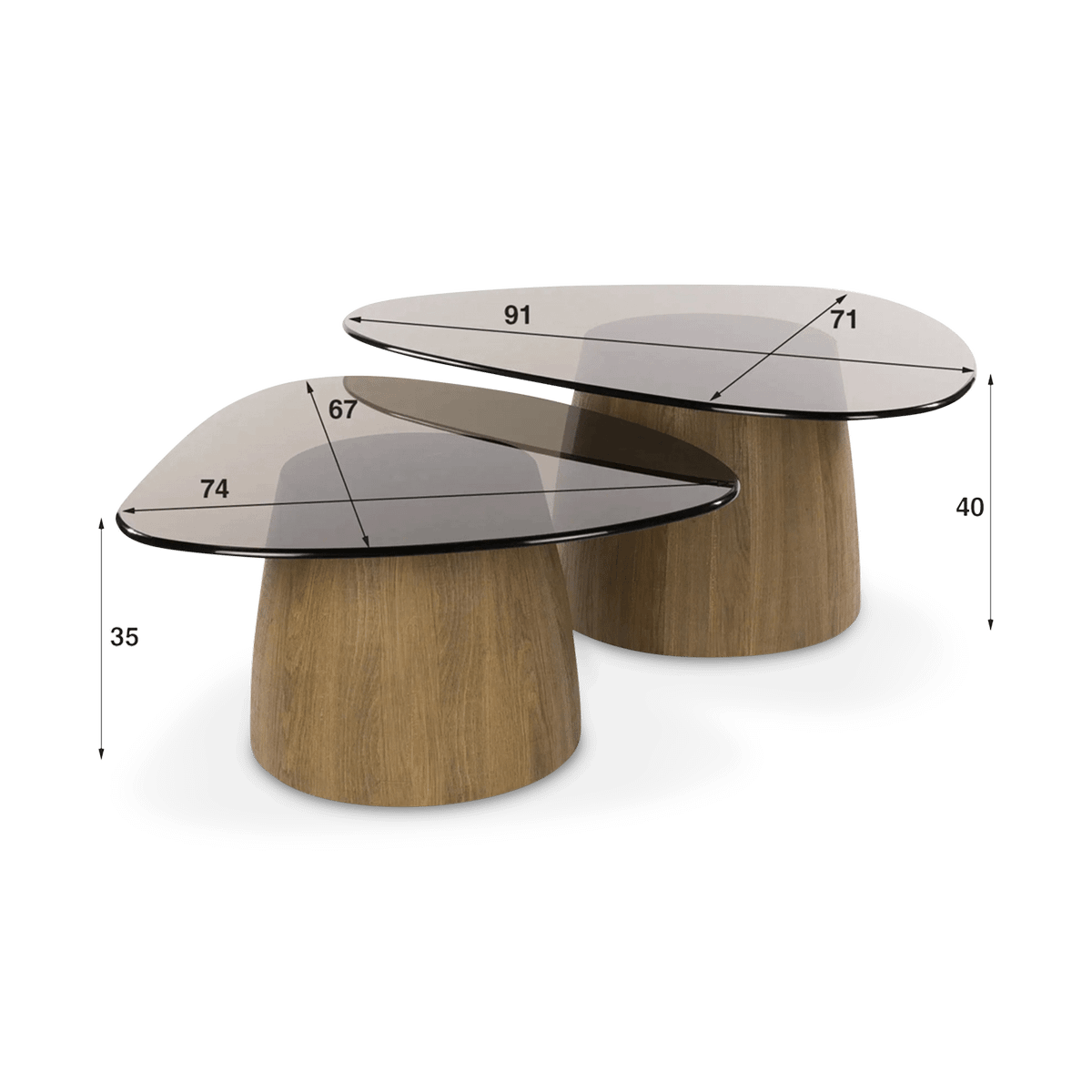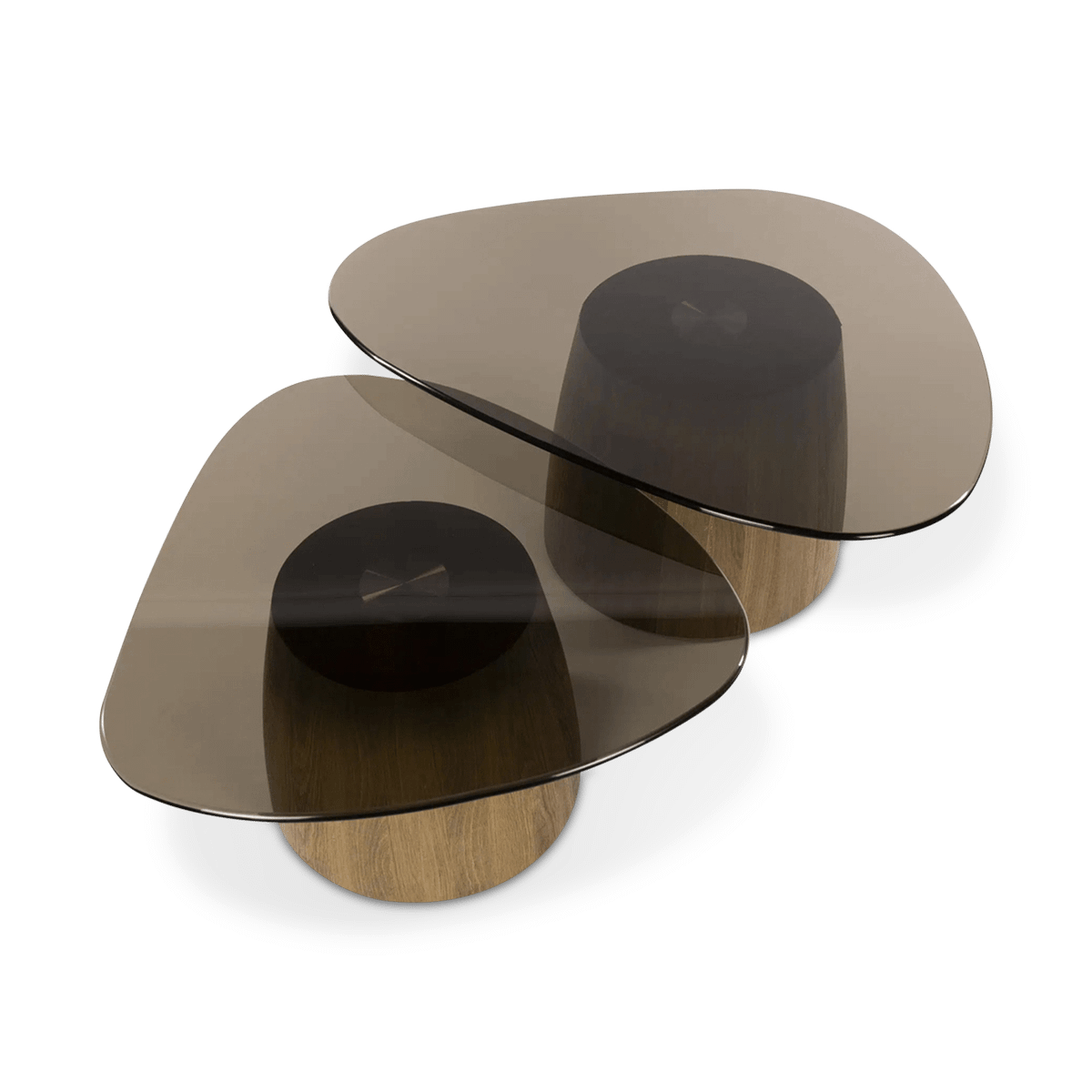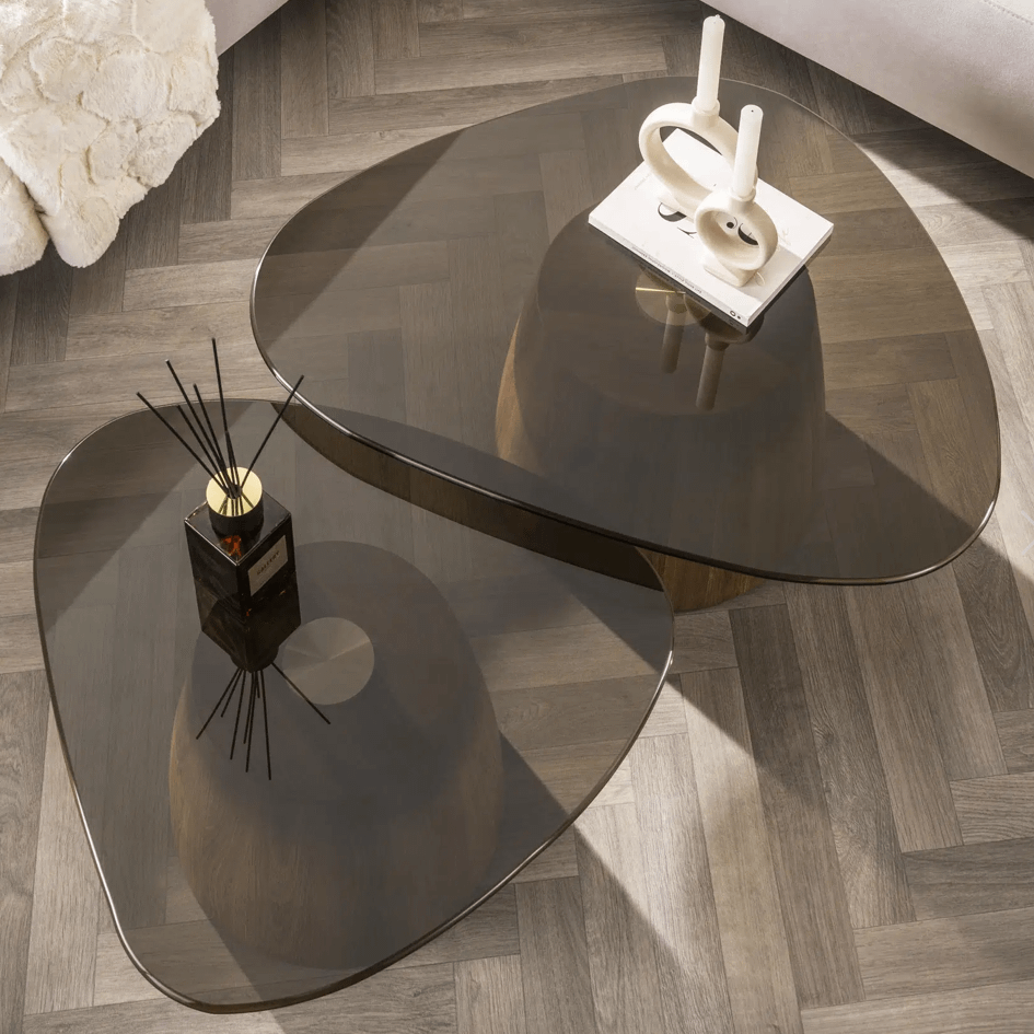 De ARYAN Salontafelset brengt modern design en natuurlijke warmte perfect samen. Deze elegante set bestaat uit twee tafels met organisch driehoekige glasbladen in getint glas, rustend op massieve houten onderstellen met een natuurlijke houtfineerafwerking.