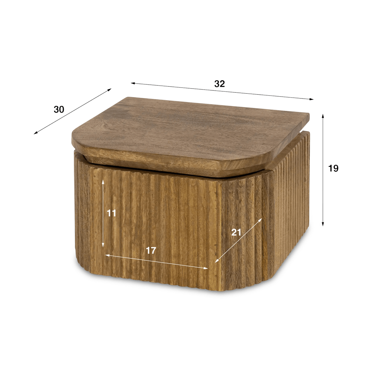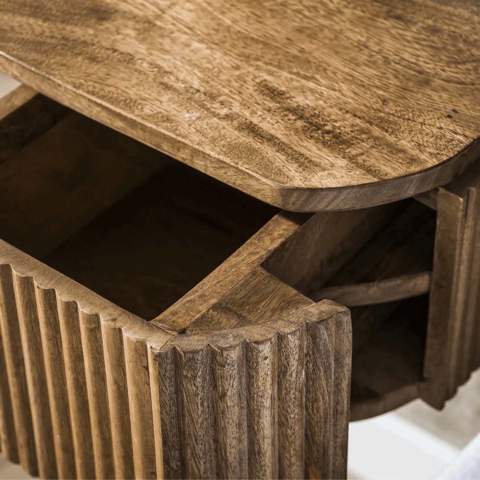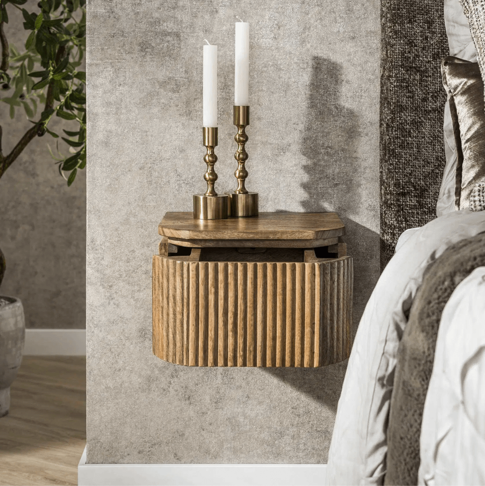 De BRECHT Nachttafel combineert een strak design met natuurlijke charme. Dit compacte, zwevende nachtkastje is vervaardigd uit massief mangohout en heeft een geribbelde frontstructuur die zorgt voor een stijlvolle, ambachtelijke uitstraling.