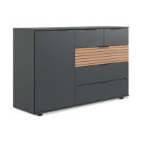 De CASPER Commode combineert een strakke, moderne uitstraling met warme natuurlijke accenten. De grafietkleurige afwerking geeft een tijdloze en elegante look, terwijl het eiken accent in de lades zorgt voor een subtiele, decoratieve touch. Deze commode is niet alleen een stijlvolle toevoeging aan je slaapkamer, maar ook een praktische opbergoplossing.