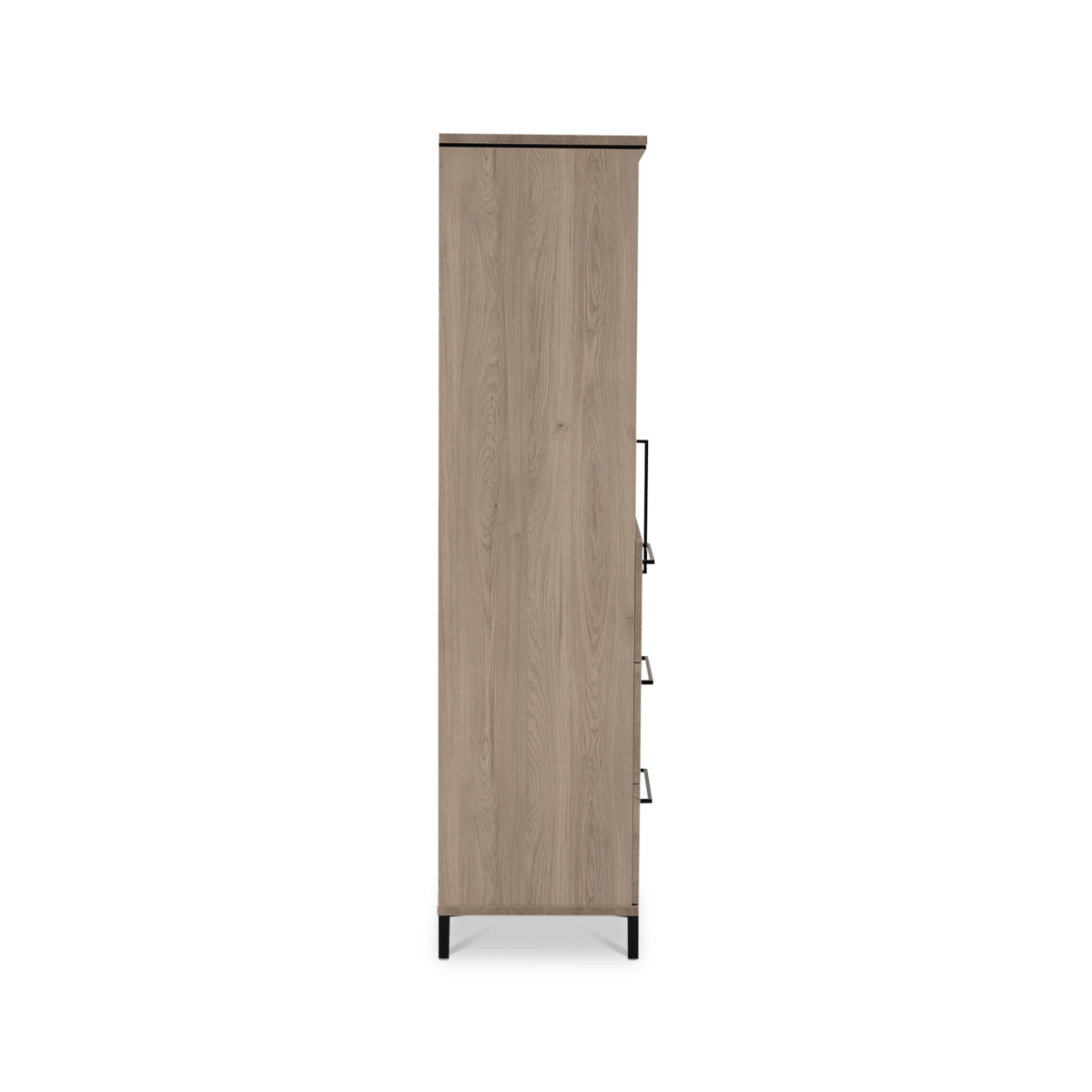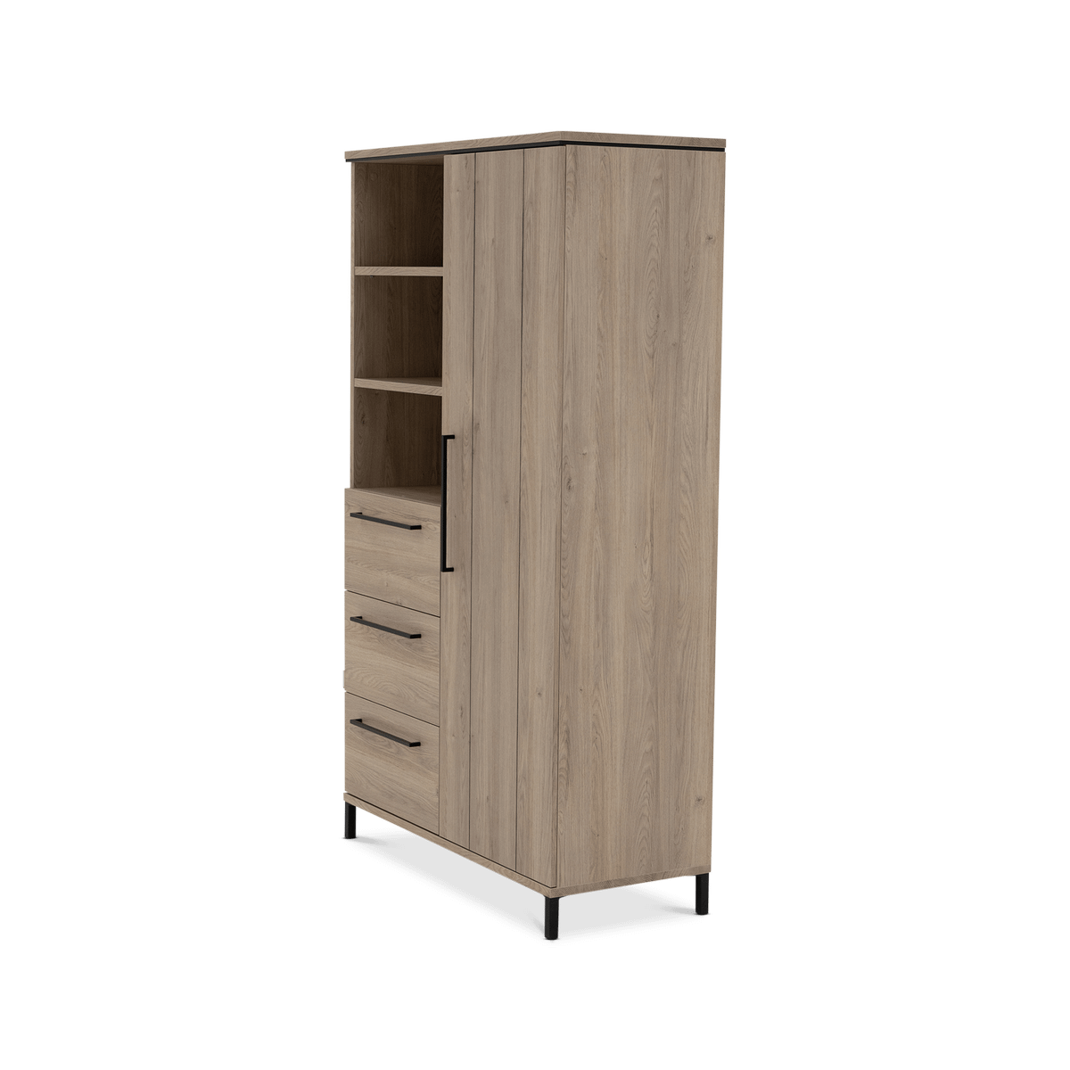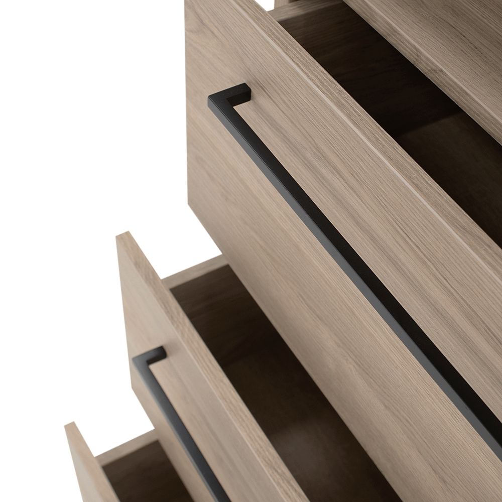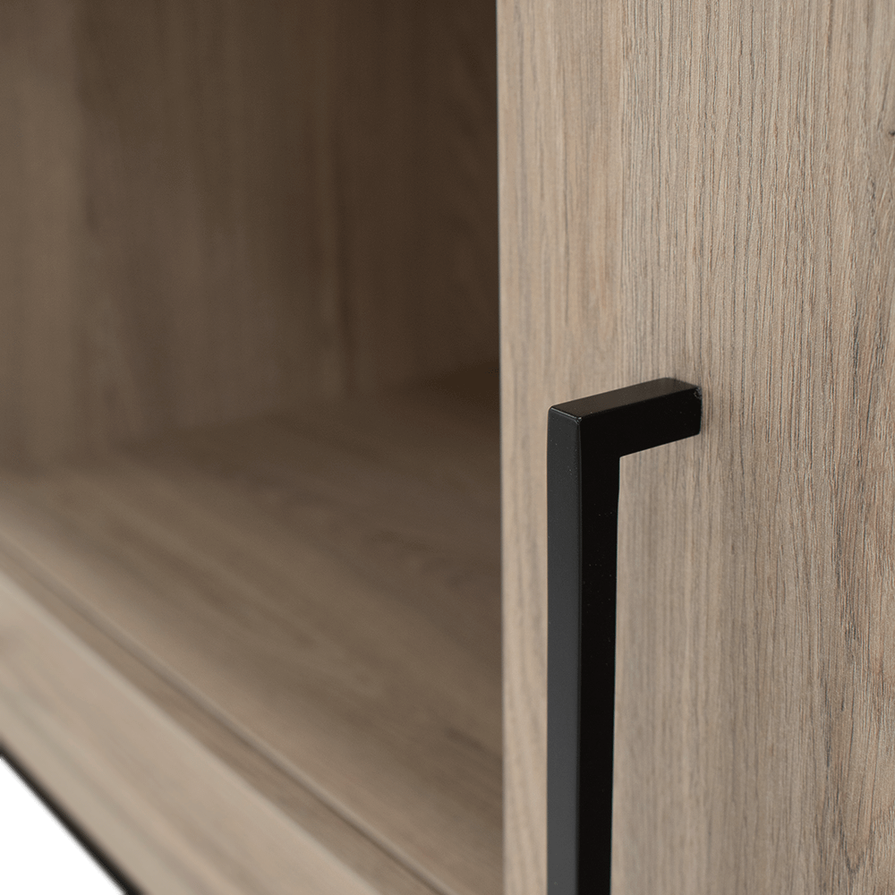 De warme houtlook en strakke belijning geven Wandkast MARCEAU een tijdloze uitstraling die moeiteloos aansluit bij zowel moderne als meer natuurlijke interieurs. De slanke, zwarte handgrepen zorgen voor een subtiel contrast en versterken het eigentijdse karakter.