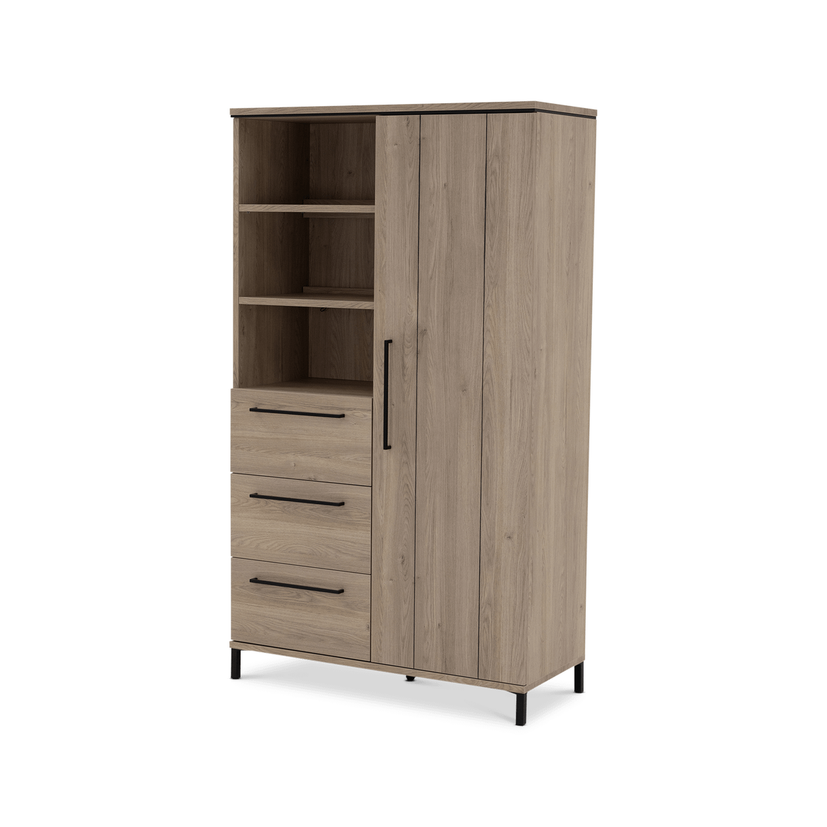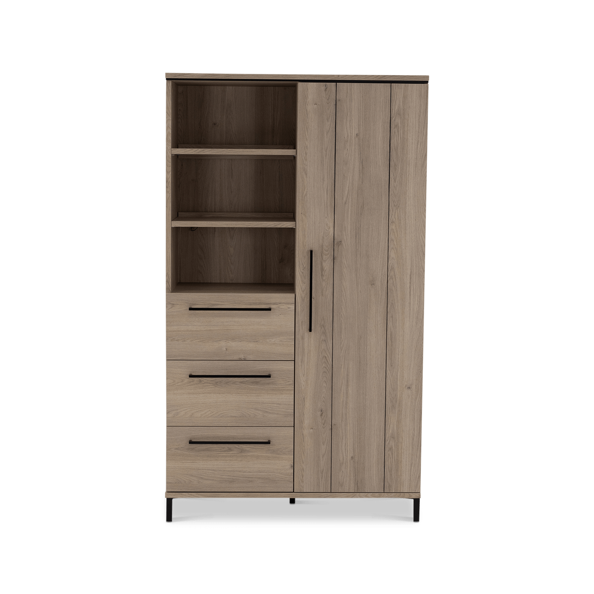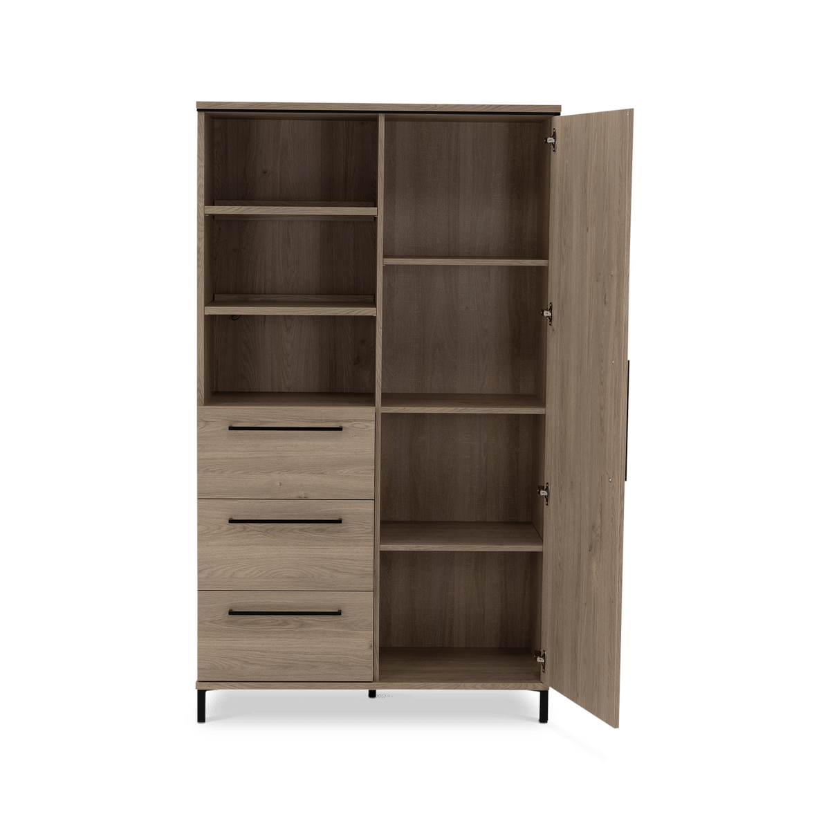 De warme houtlook en strakke belijning geven Wandkast MARCEAU een tijdloze uitstraling die moeiteloos aansluit bij zowel moderne als meer natuurlijke interieurs. De slanke, zwarte handgrepen zorgen voor een subtiel contrast en versterken het eigentijdse karakter.