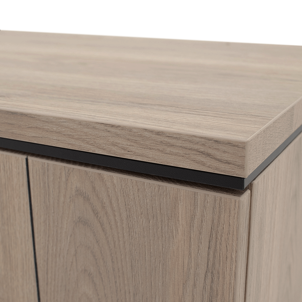 De warme houtlook en strakke vormgeving zorgen voor een tijdloze basis die moeiteloos aansluit bij een modern interieur. De zwarte handgrepen geven het geheel een subtiel grafisch accent en versterken de eigentijdse uitstraling.