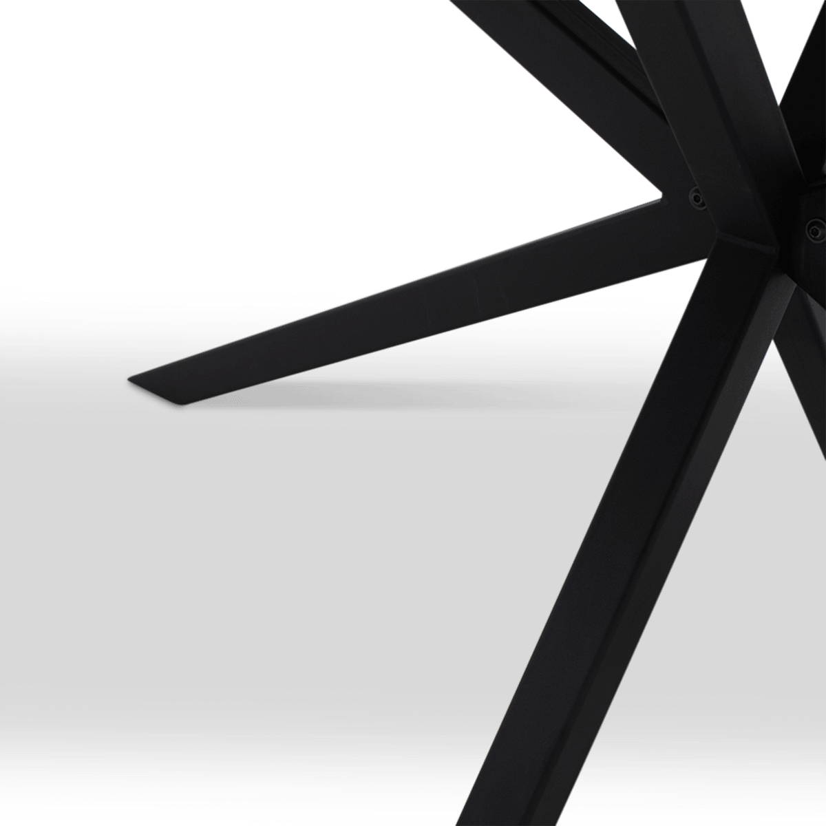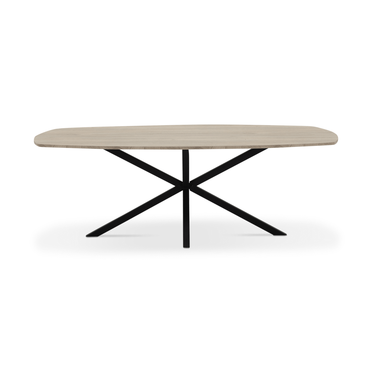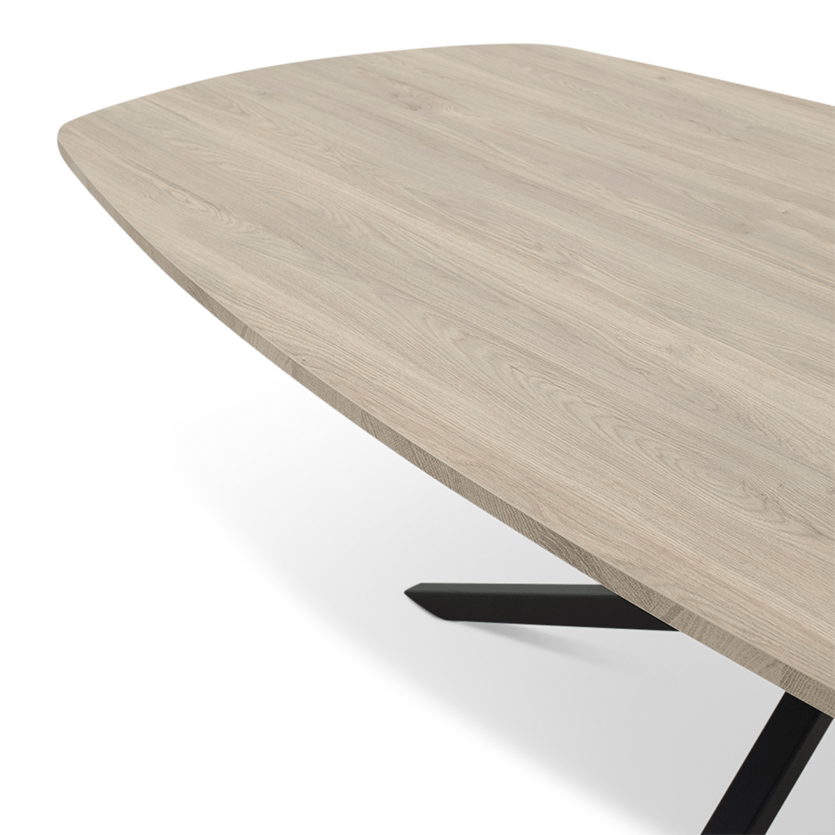 Het Deens ovale blad in Old Oak zorgt voor een zachte vorm en is afgewerkt in Lamulux: mooi én makkelijk in onderhoud. De zwarte stalen sterpoot geeft de tafel een stevige basis en een strak contrast.