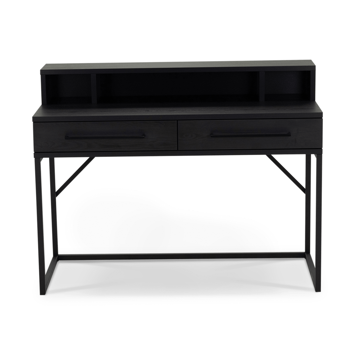 Met een breedte van 120cm biedt het voldoende ruimte voor laptop, documenten en accessoires. De twee ruime lades houden alles netjes uit het zicht, terwijl de open opbergvakken bovenaan zorgen voor extra overzicht en functionaliteit. Het zwarte metalen onderstel geeft het bureau stabiliteit en een eigentijdse uitstraling.