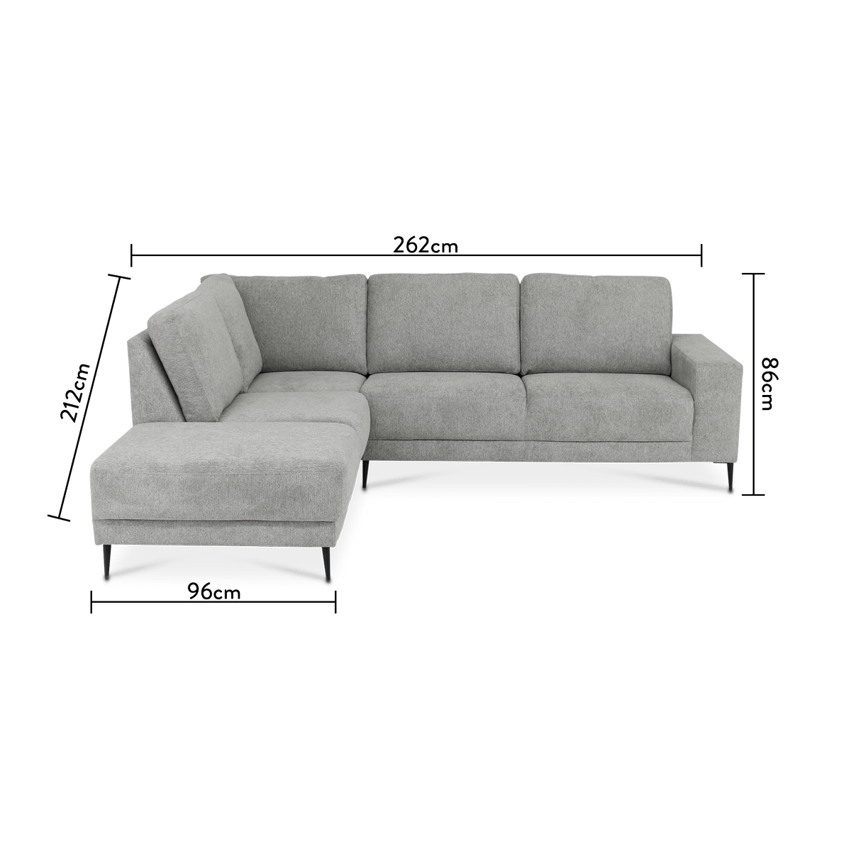 Ontdek de tijdloze elegantie van het hoeksalon SEVILLA. Met zijn compacte afmetingen van 262 cm breed, 93 cm diep en 212 cm lang past dit salon perfect in elke woonruimte.