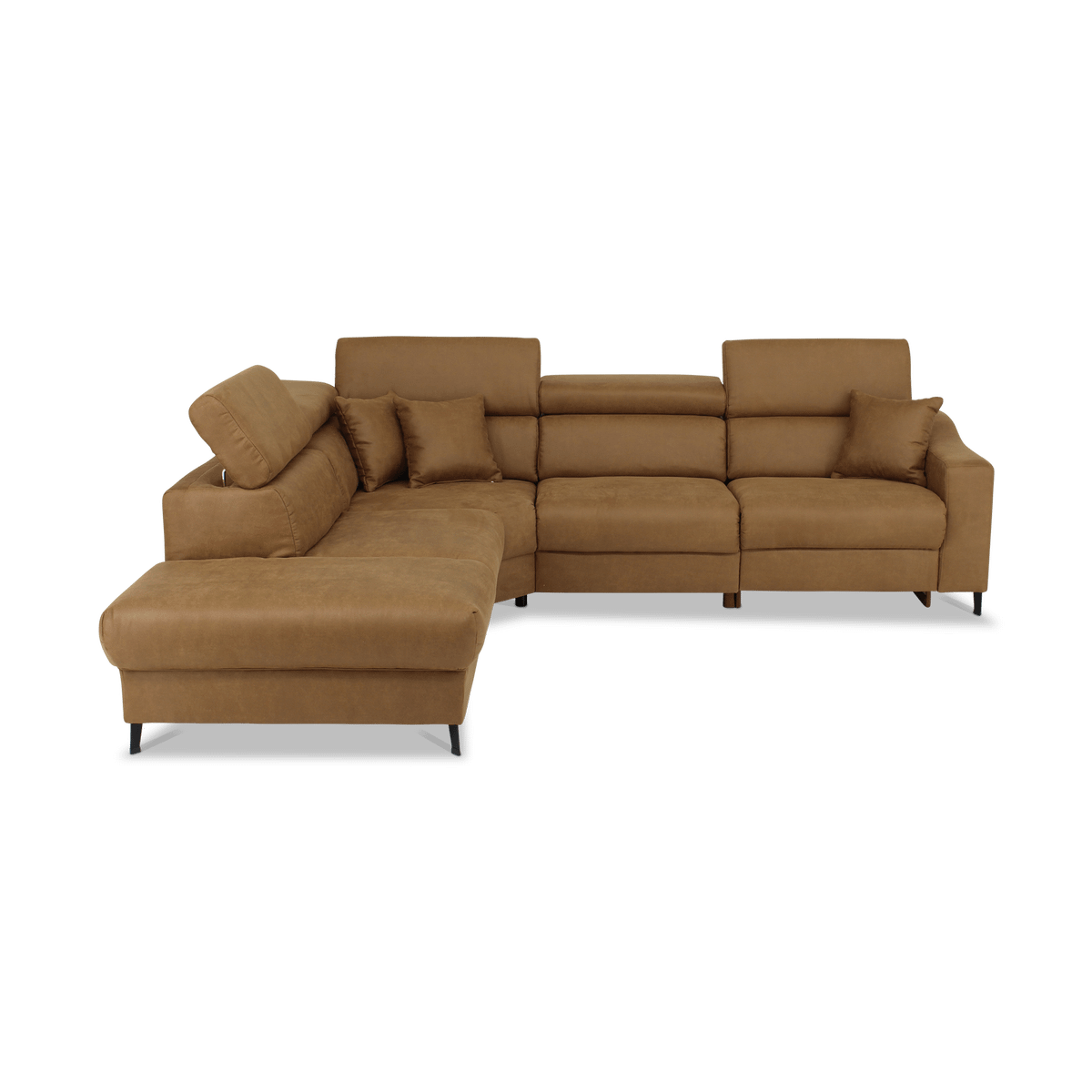 De hoeksalon KAZAN, uitgevoerd in een prachtige cognac kleur, straalt warmte en elegantie. De zwarte poten geven Kazan een modern en strak uiterlijk, en contrasteren met de rijke cognac kleur van de bekleding.