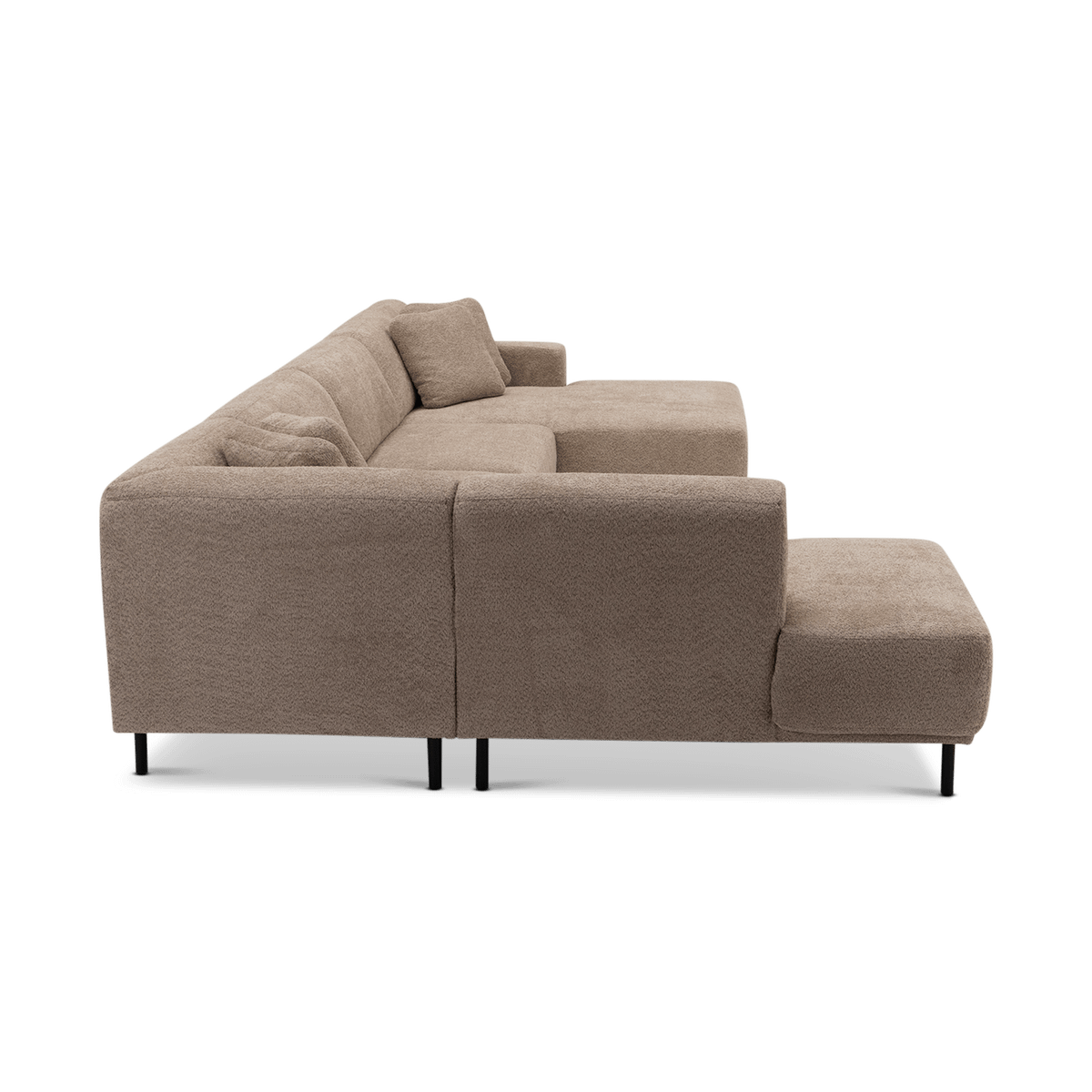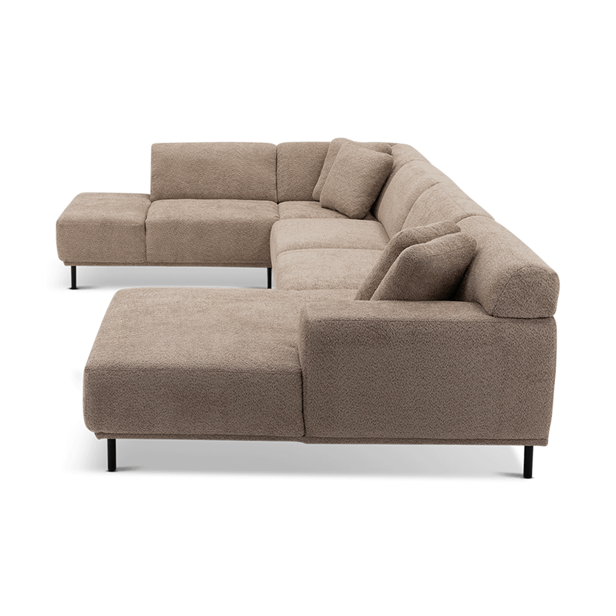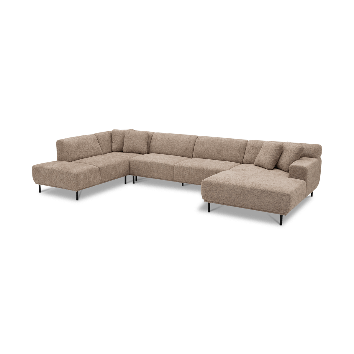 Uitgevoerd in een subtiel roze stof, straalt deze zetel warmte en verfijning uit. Met een royale breedte van 390 cm biedt hij ruim plaats voor het hele gezin. De lage rugleuningen, zachte kussens en strakke lijnen zorgen voor een eigentijdse uitstraling die perfect past in moderne interieurs.