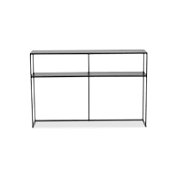 Console FORKA heeft een volledige afwerking in zwart gepoedercoated metaal. Dit eenvoudige, stoere en stijlvolle tafeltje is perfect voor in de hal of de slaapkamer. Perfect om wat mooie herinneringen, een plant en zelf een schaal voor de sleutels op te zetten. Dankzij de 2 niveaus kan je er heel wat moois op kwijt.Deze sidetable heeft een afmeting van 79x120x35 cm. Deze console heeft een breedte van 130cm en is 91cm hoog.