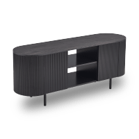 Met het tv-meubel PORTO geef je jouw woonkamer een eigentijdse touch. Dit ovale meubel van 140 cm breed combineert speelse vormen met een strak ontwerp. De twee deuren, afgewerkt met stijlvolle verticale latjes, bieden genoeg opbergruimte om kabels, afstandsbedieningen en andere accessoires netjes uit het zicht te houden. In de twee open nissen kun je je favoriete decorstukken kwijt of je mediabox eenvoudig plaatsen.
