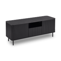 Het tv-meubel PORTO combineert strak design met functioneel gemak. Met zijn breedte van 140 cm en donkere bruine afwerking biedt dit meubel de perfecte plek voor je televisie en accessoires. De twee deuren, afgewerkt met verfijnde verticale latjes, verbergen moeiteloos je spullen en houden alles opgeruimd. De handige lade en open nis geven extra ruimte voor je mediabox, gameconsole of decoratieve items.