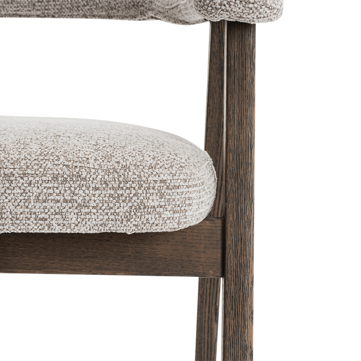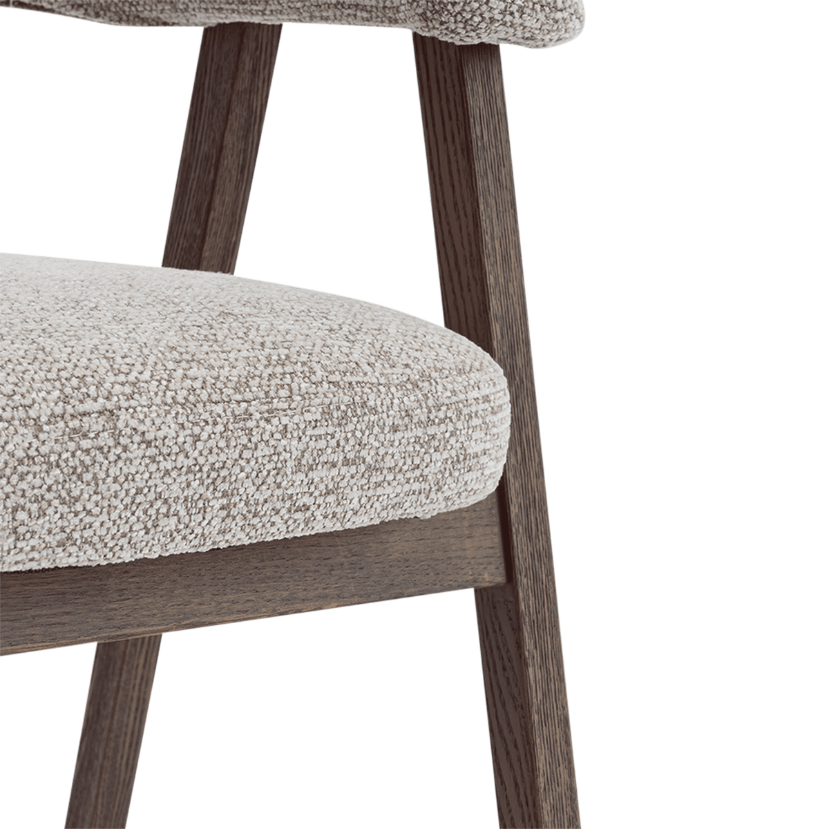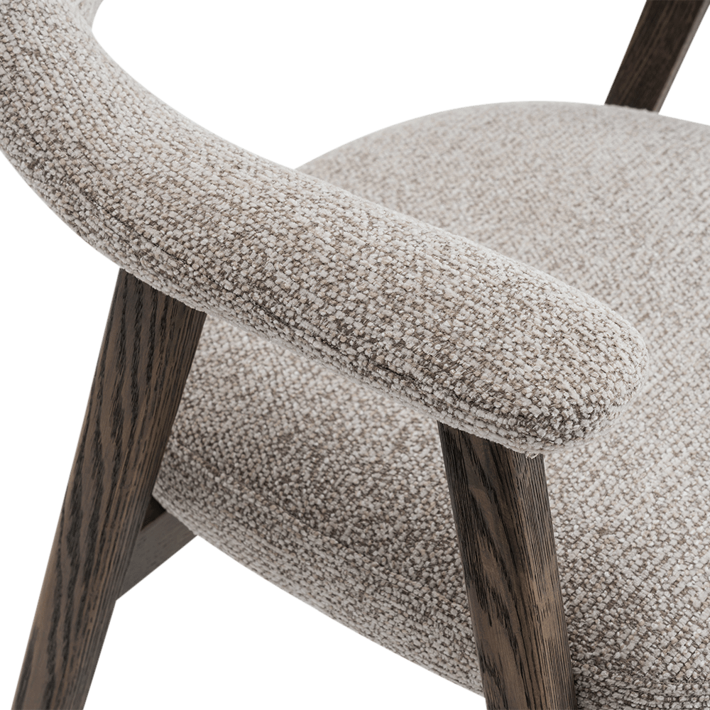 De massieve poten in smoked eik geven de stoel een robuuste, elegante uitstraling, terwijl de zandkleurige bekleding zorgt voor een zachte en luxueuze toets. De vloeiende lijnen van de armleuningen sluiten naadloos aan op de comfortabele zitting en rug, waardoor TOVA niet alleen esthetisch aantrekkelijk is, maar ook aangenaam zit.