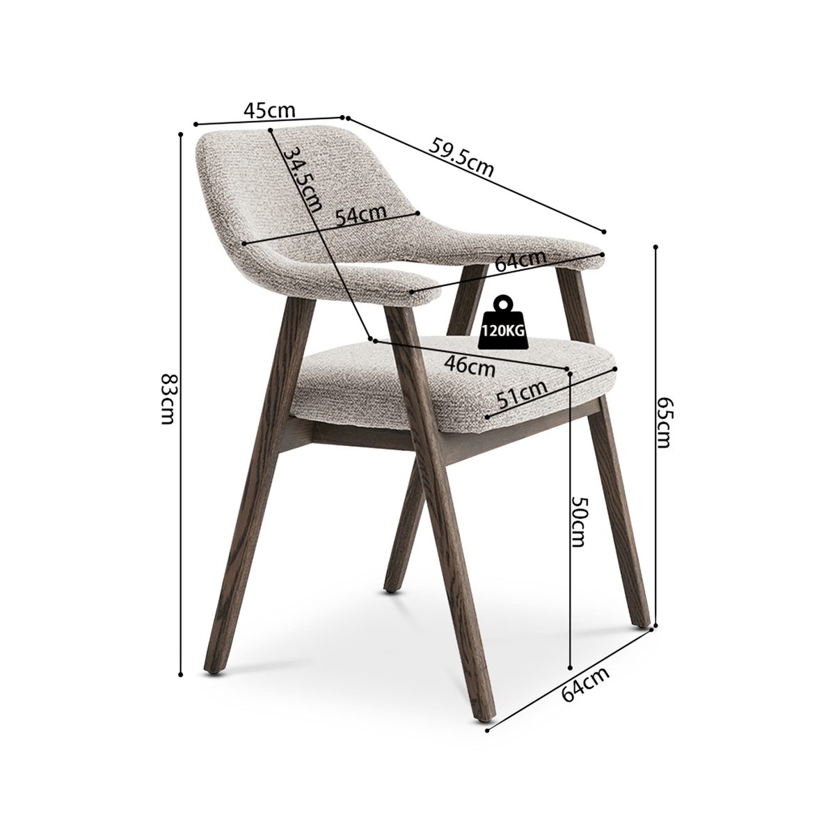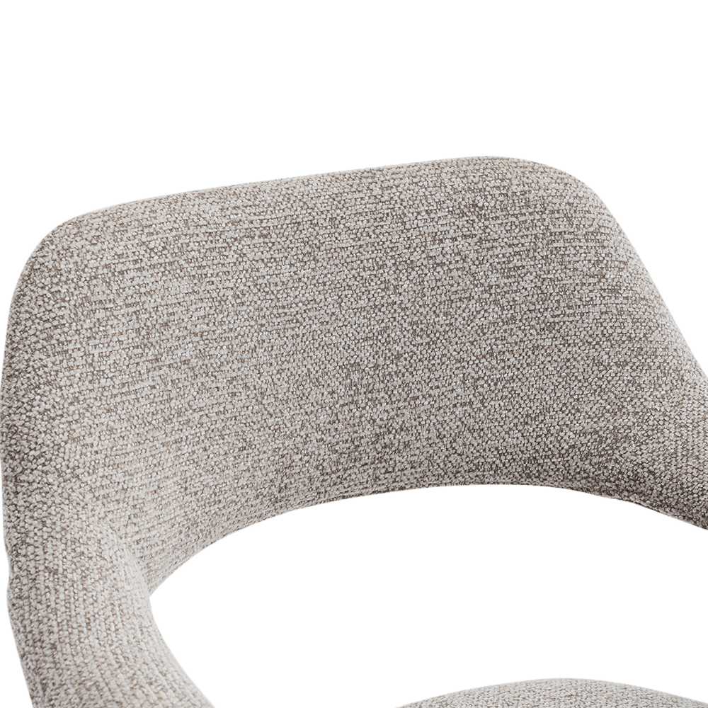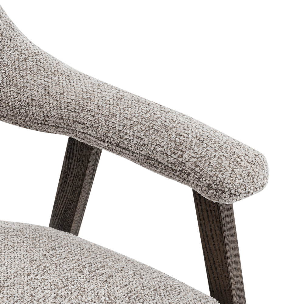 De massieve poten in smoked eik geven de stoel een robuuste, elegante uitstraling, terwijl de zandkleurige bekleding zorgt voor een zachte en luxueuze toets. De vloeiende lijnen van de armleuningen sluiten naadloos aan op de comfortabele zitting en rug, waardoor TOVA niet alleen esthetisch aantrekkelijk is, maar ook aangenaam zit.