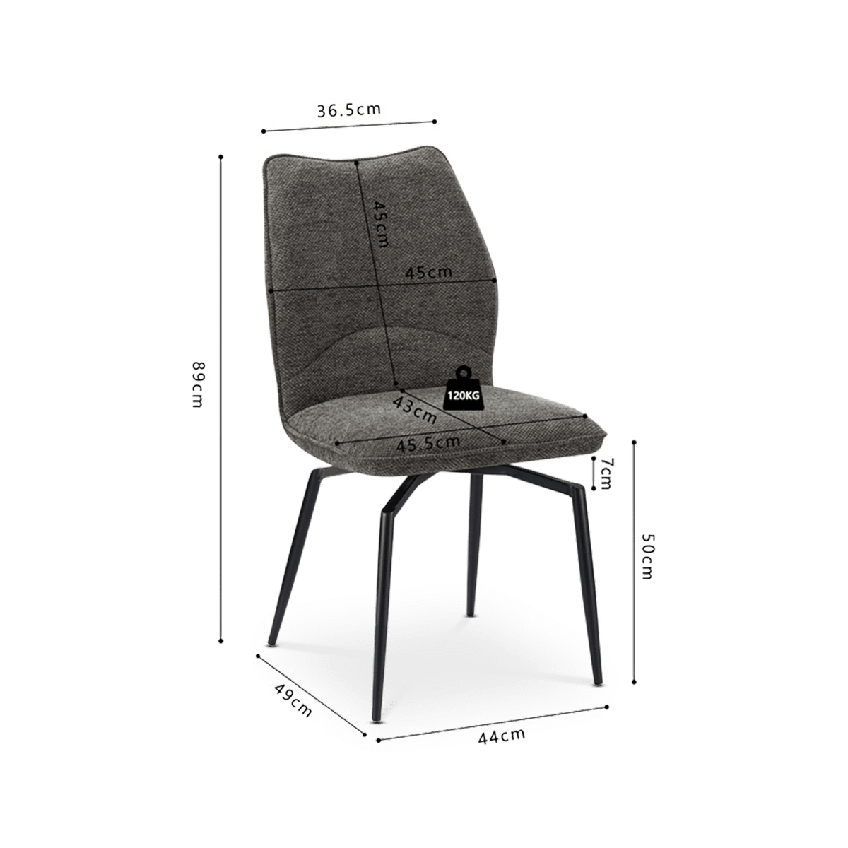 De Draaibare Stoel ANETA in Donkergrijs combineert eigentijds comfort met een verfijnde uitstraling. De zachte, geweven bekleding in donkergrijze tint geeft warmte aan elk interieur, terwijl de subtiel gevormde rugleuning optimale ondersteuning biedt. Dankzij het draaimechanisme geniet je van extra bewegingsvrijheid zonder aan elegantie in te boeten. De zwarte metalen poten zorgen voor een moderne toets en maken van ANETA een perfecte mix tussen functionaliteit en design — ideaal voor wie stijl en gemak wil verenigen aan de eettafel.
