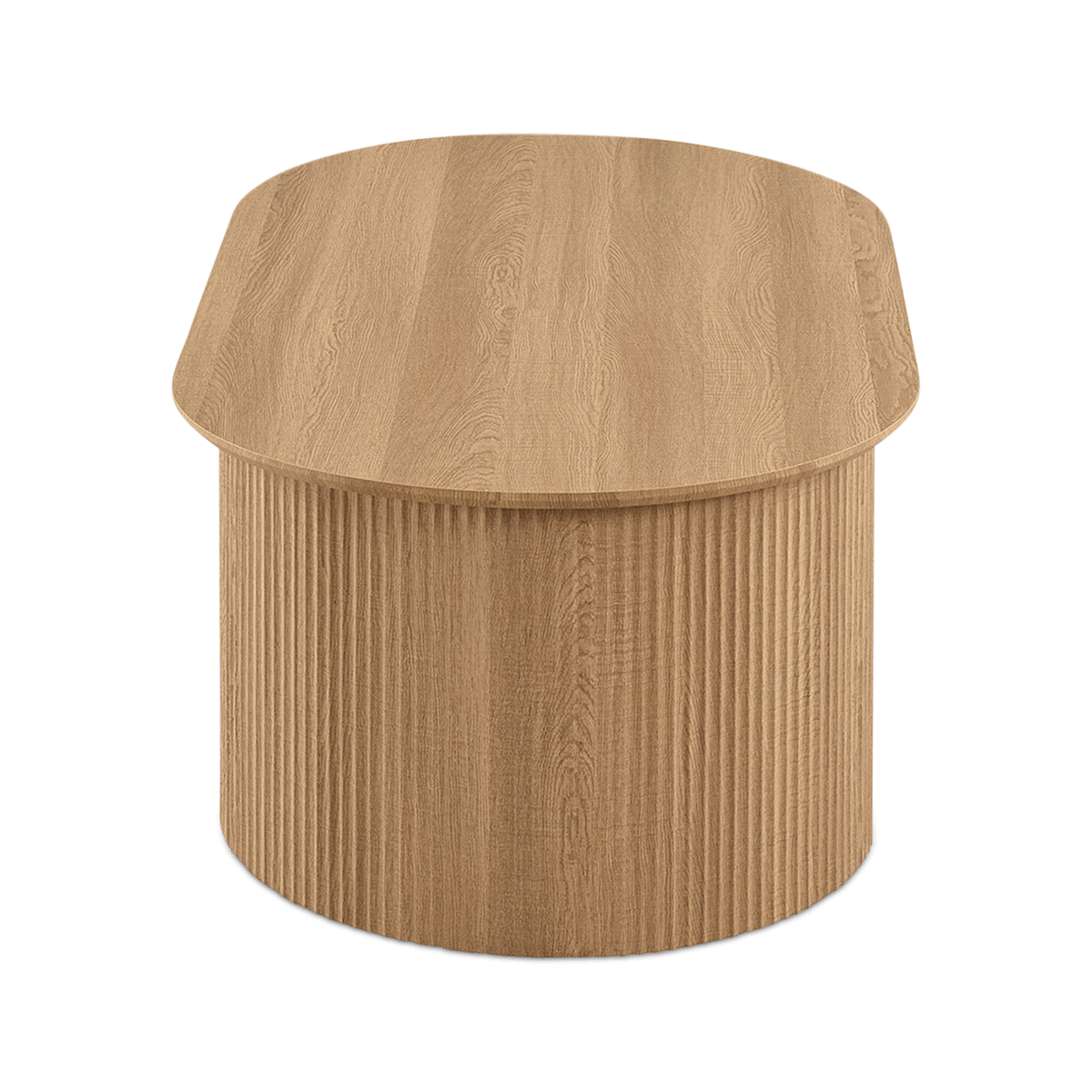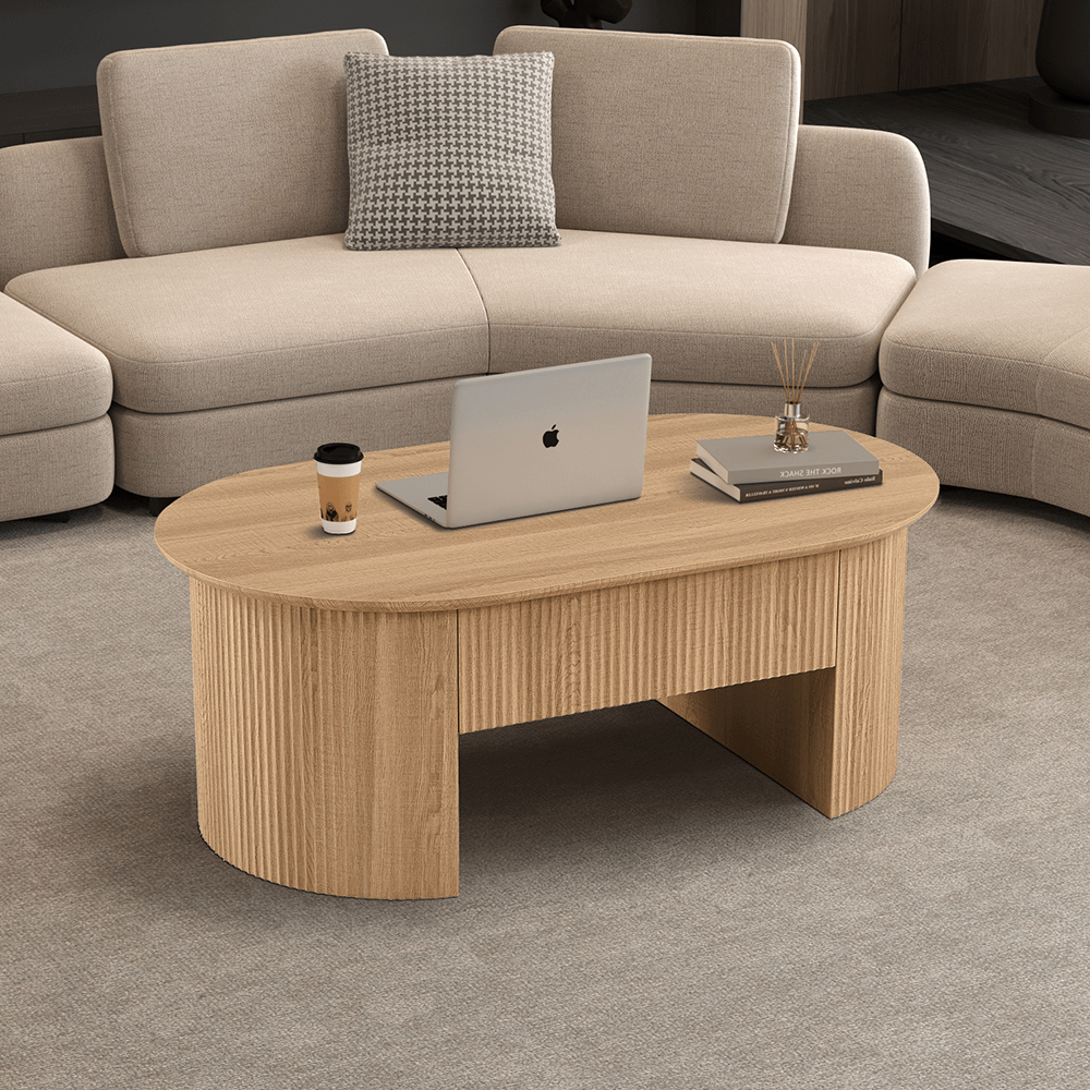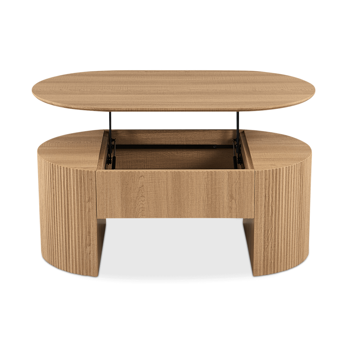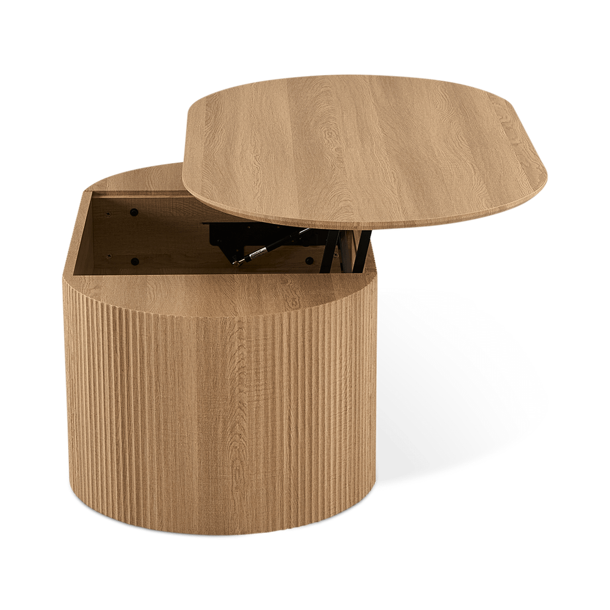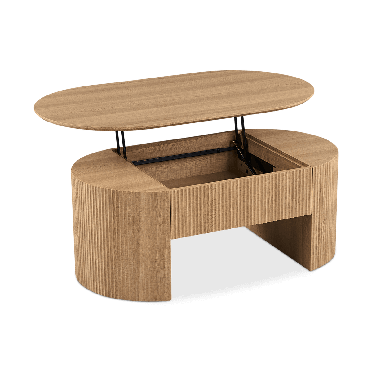 Het ovale tafelblad geeft de tafel een moderne uitstraling, terwijl de ribstructuur aan de zijkanten zorgt voor een stijlvol detail. Dankzij de lift-top functie kan het tafelblad eenvoudig omhoog worden gebracht — ideaal om comfortabel te werken of te eten vanuit de zetel.