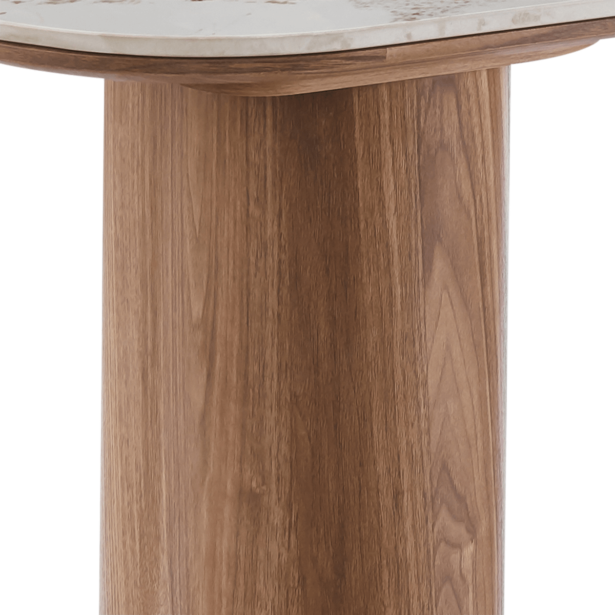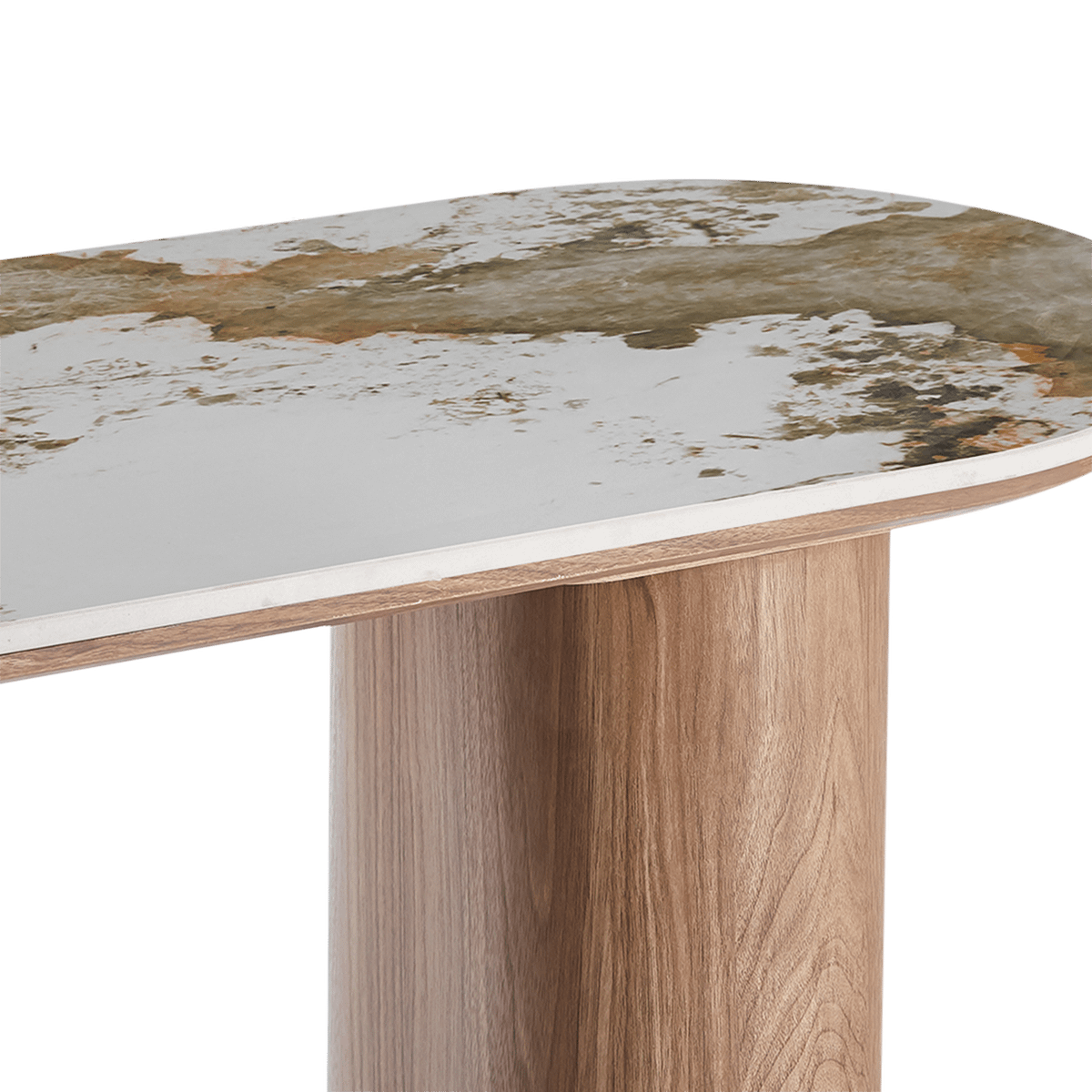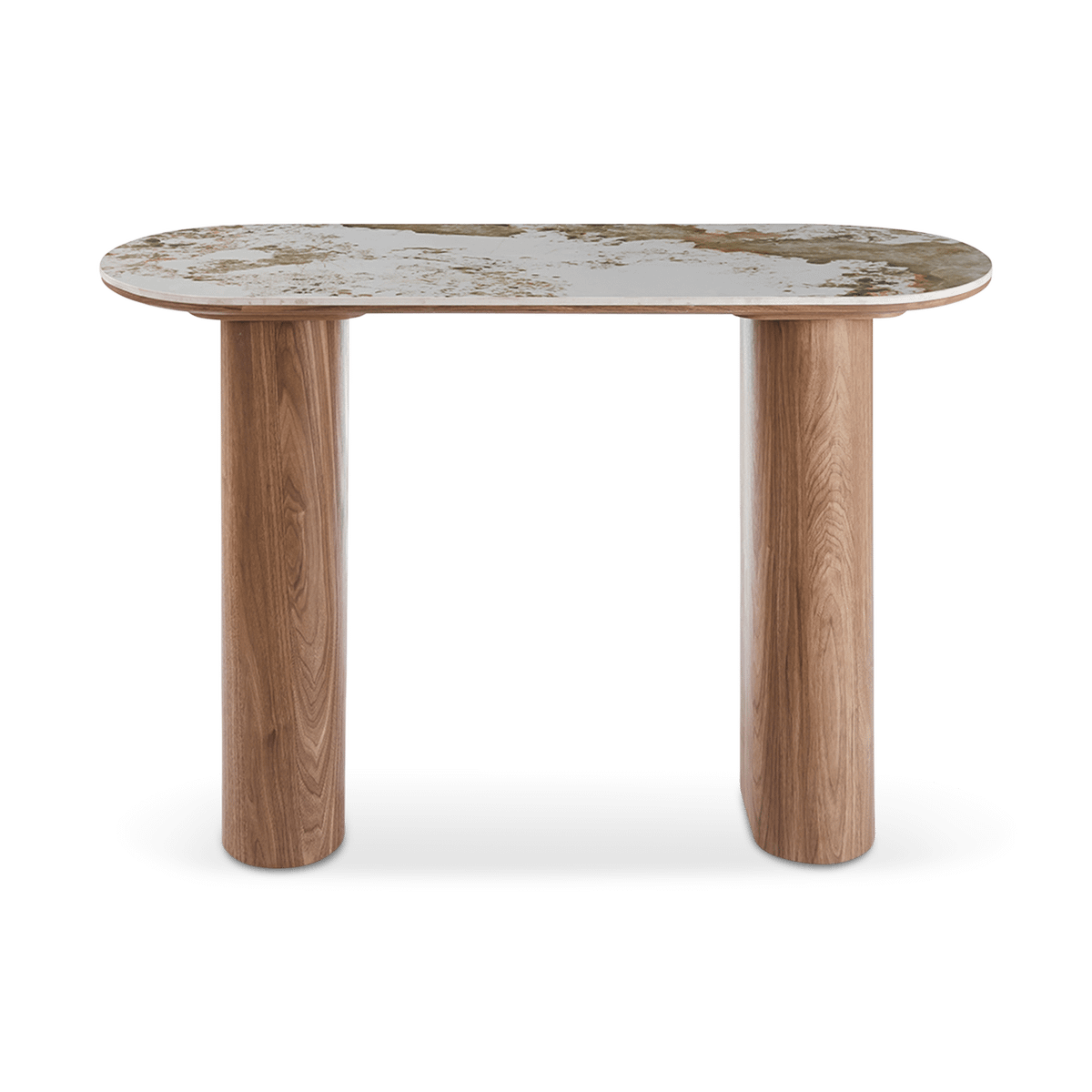 De robuuste, cilindervormige poten in houtlook creëren een mooi contrast met het verfijnde blad en zorgen voor een stabiele basis. Dankzij het slanke formaat is de Selina ideaal als stijlvolle sidetable achter een zetel, in de inkomhal of als decoratief meubel tegen de muur.