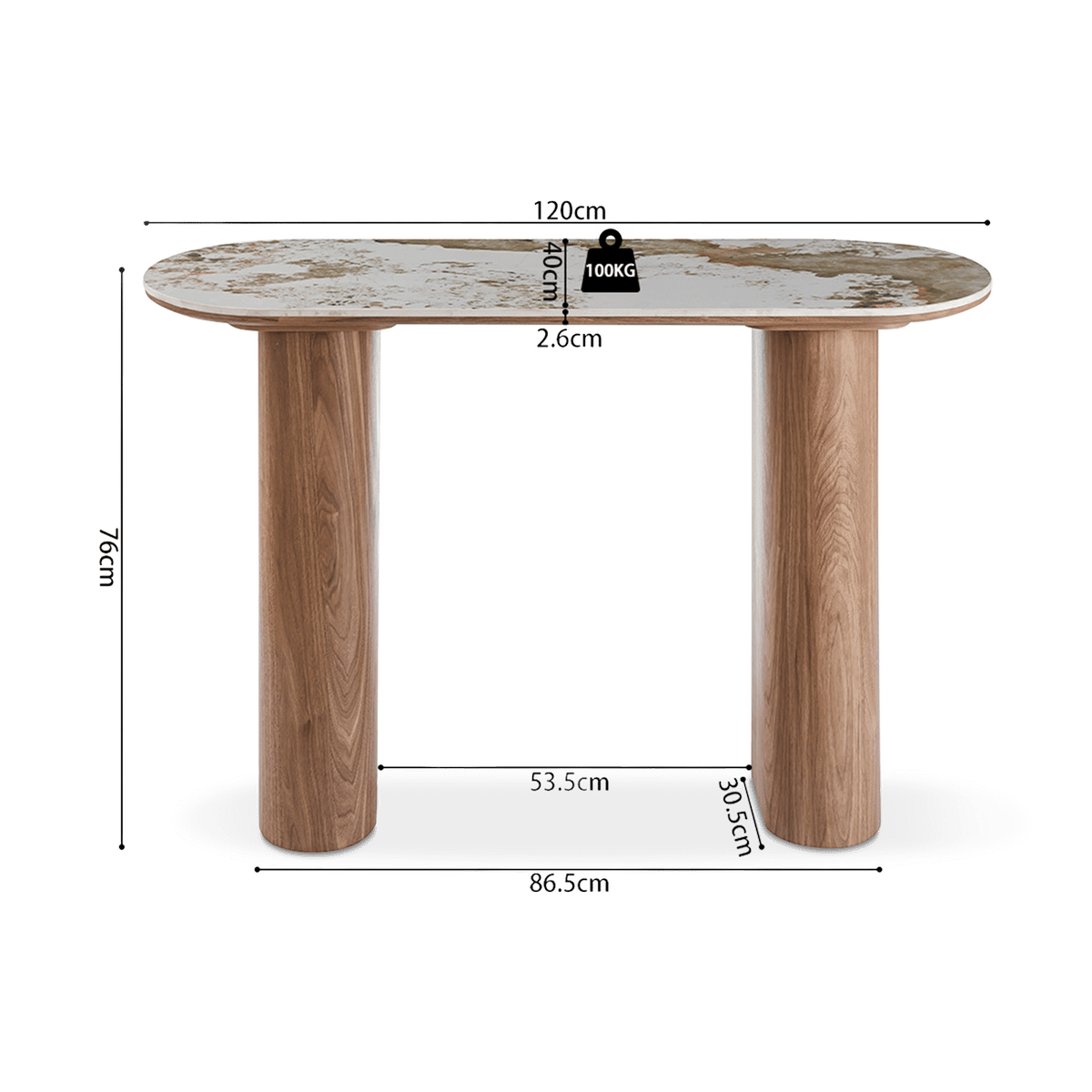 Het elegante tafelblad met subtiele goudbruine accenten vormt een echte blikvanger en zorgt voor een warme, exclusieve sfeer in je hal of leefruimte. De afgeronde vormen en zachte lijnen geven het geheel een moderne en tegelijk tijdloze uitstraling.