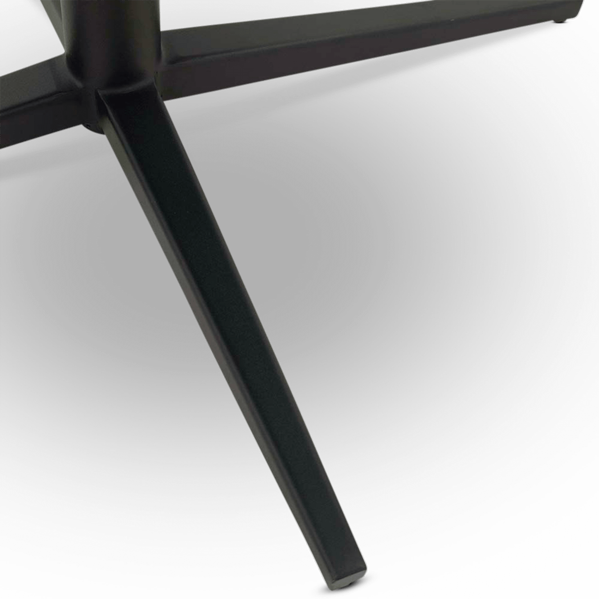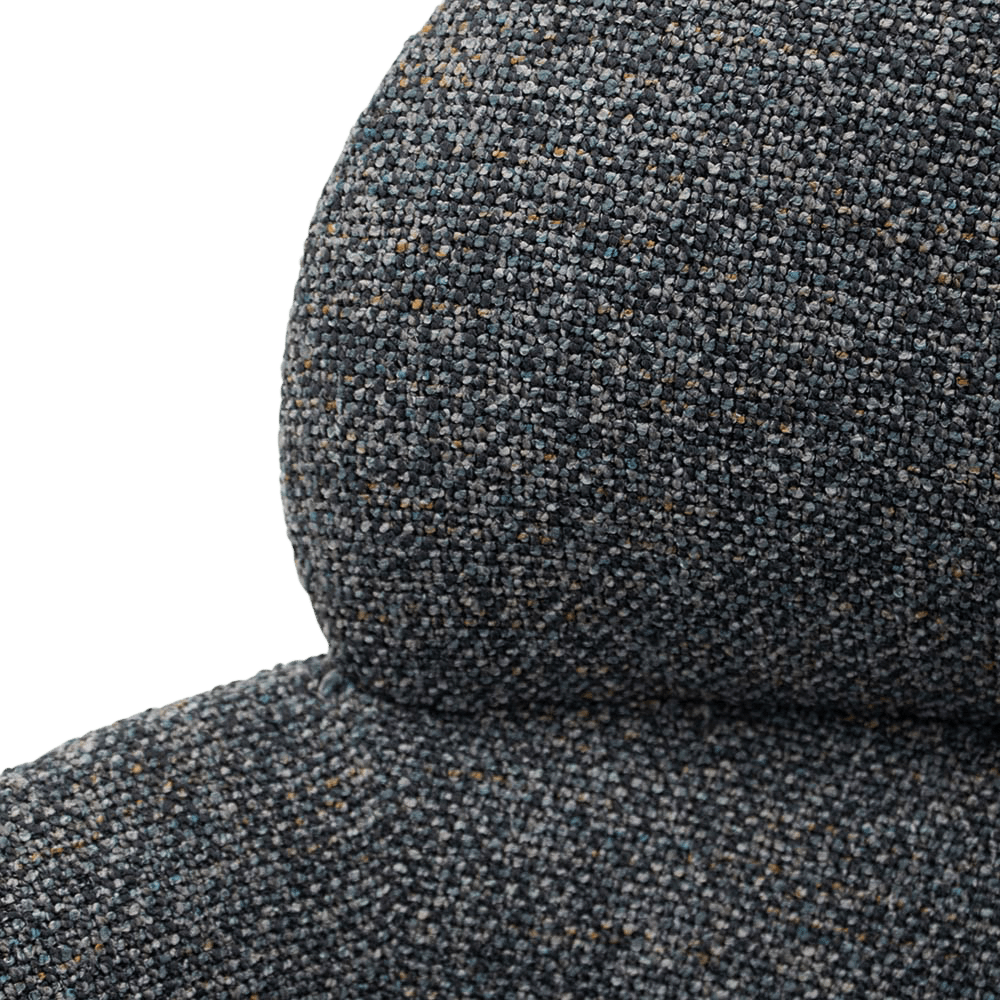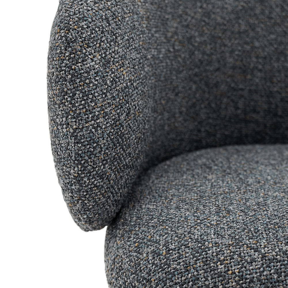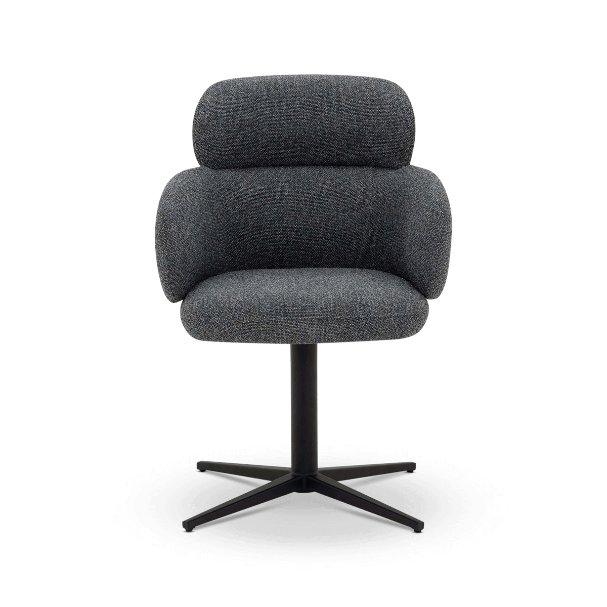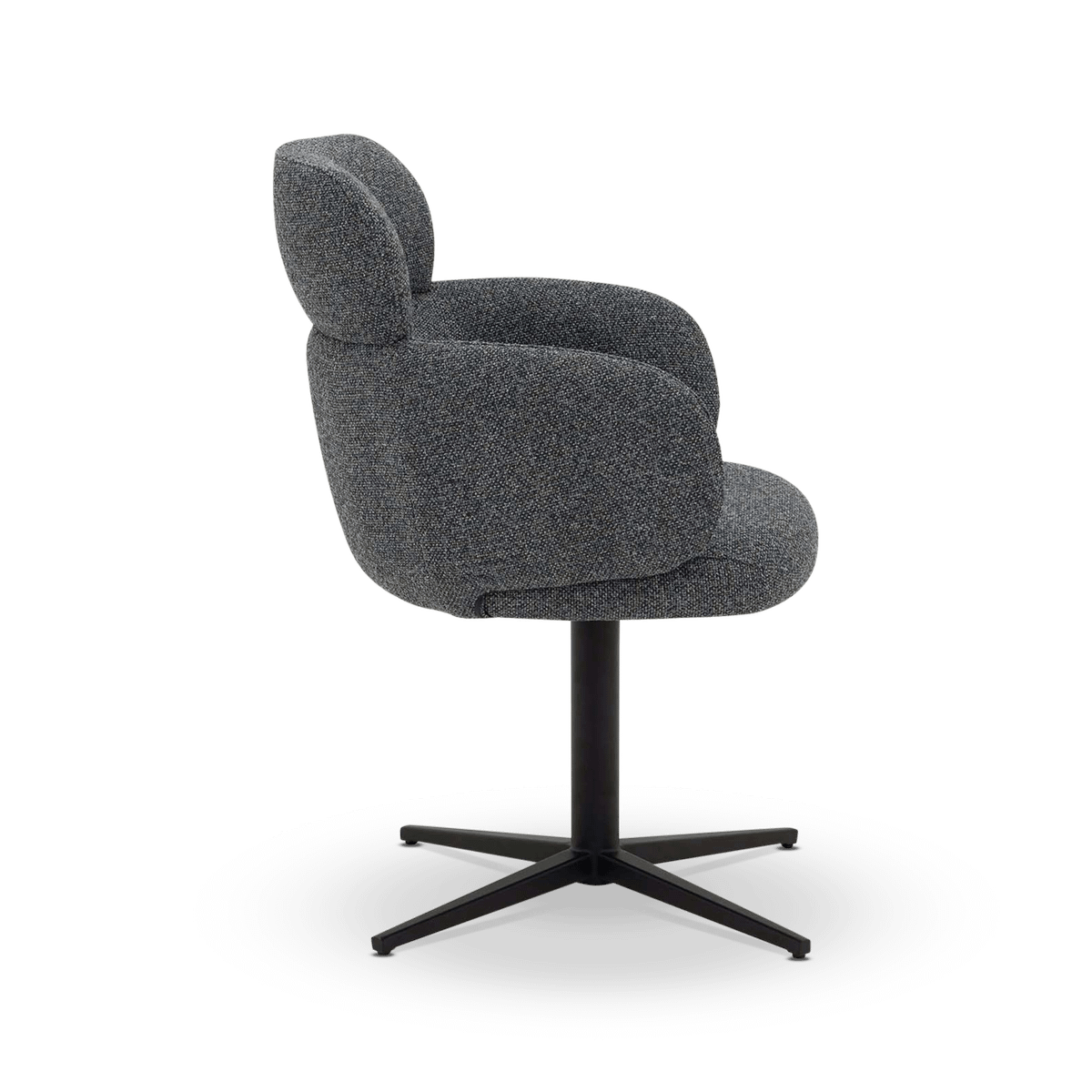 De zachte bekleding in donkergrijs met subtiele blauwe tint geeft de stoel een unieke, eigentijdse uitstraling, terwijl de zwarte metalen stervoet zorgt voor een strak en stabiel onderstel.