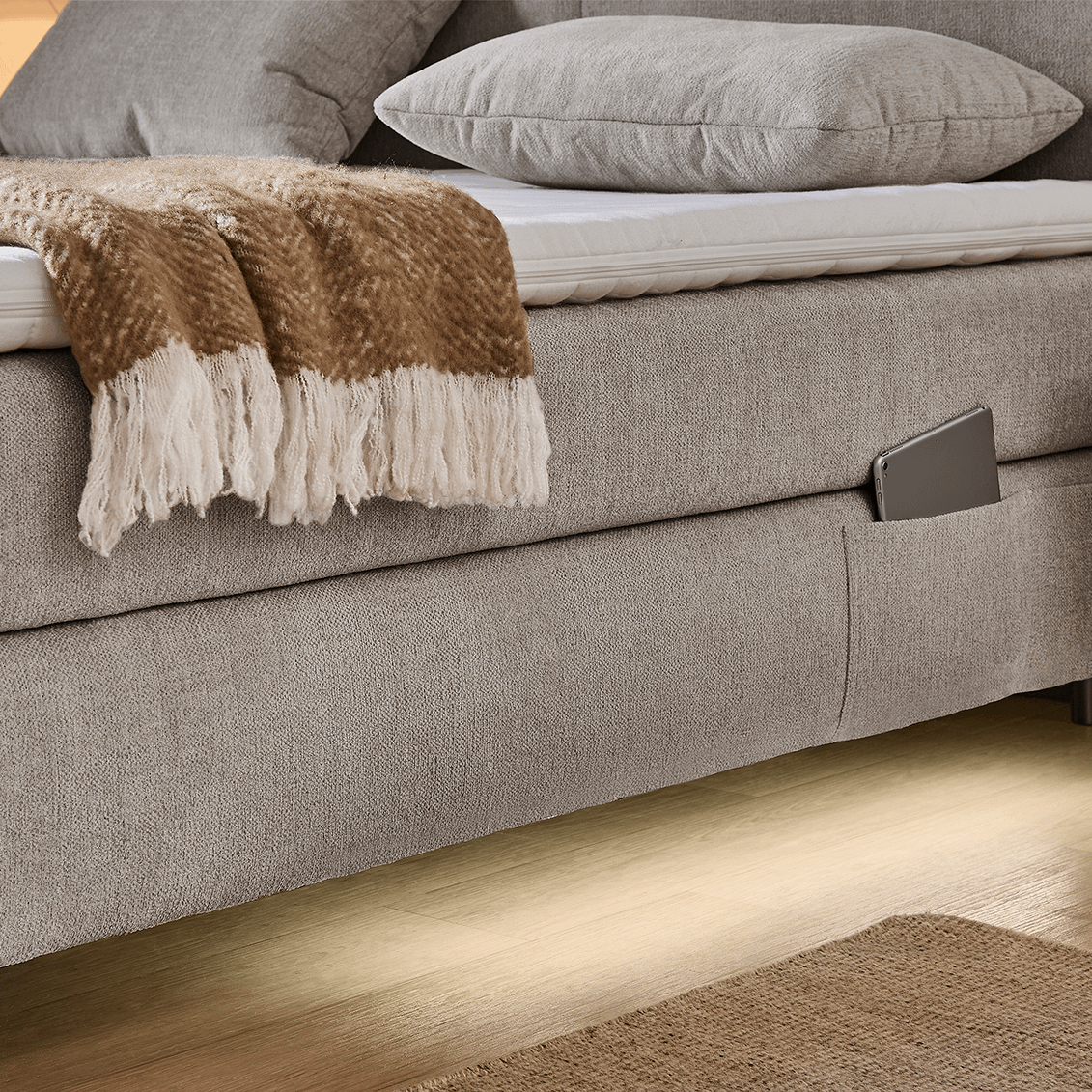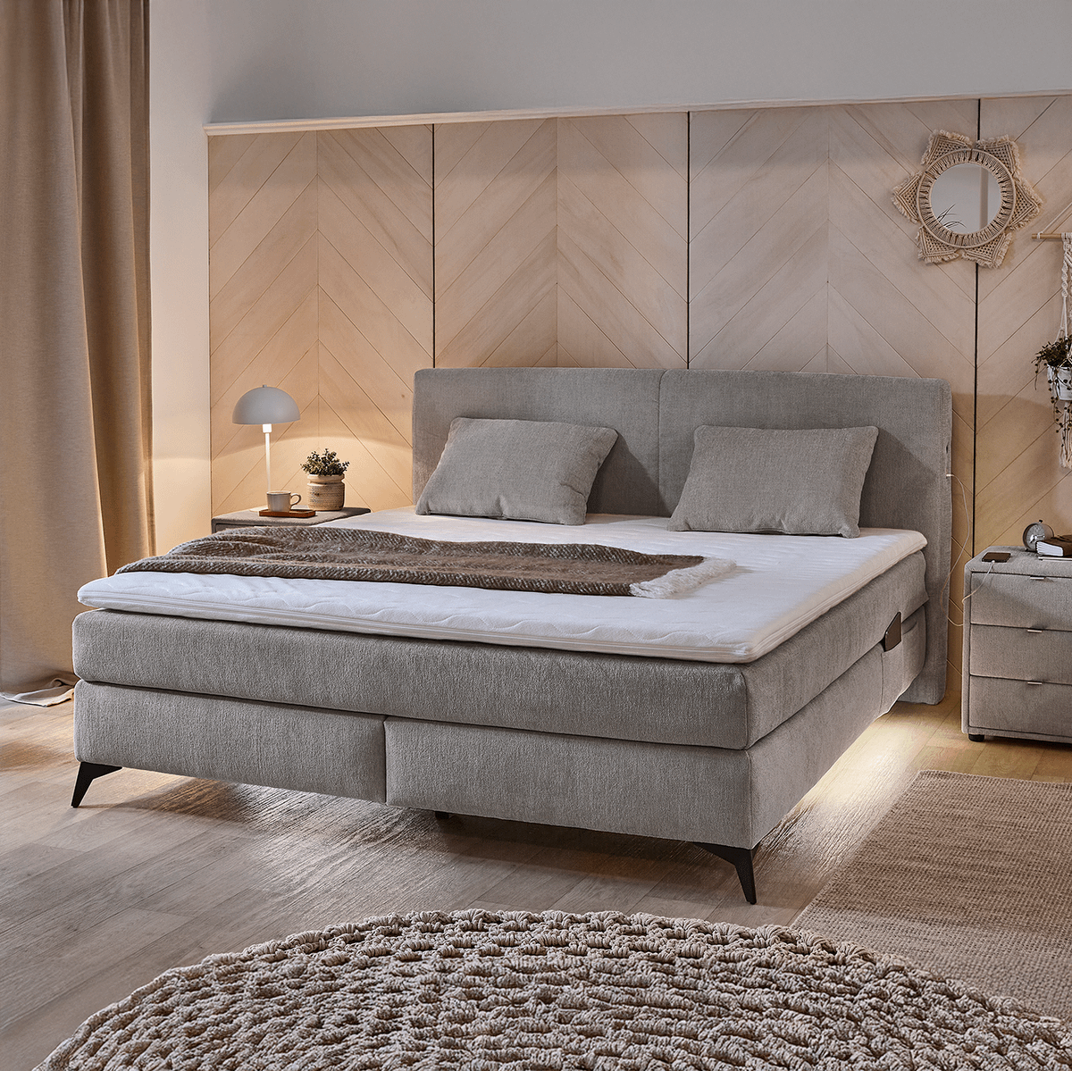 Boxspring WIJDEWEREN in Grijs staat garant voor ultiem slaapcomfort en een luxe uitstraling in de slaapkamer. Dit elegante boxspringbed combineert een tijdloos design met hoogwaardige materialen, waardoor het niet alleen comfortabel ligt maar ook een echte eyecatcher is. De hoogwaardige matras zorgt voor optimale ondersteuning, terwijl de zachte topper extra ligcomfort biedt. De stijlvolle grijze bekleding past moeiteloos in elk interieur, van modern tot klassiek. Met de Boxspring WIJDEWEREN creëer je een hotelwaardige slaapbeleving in je eigen huis – perfect voor wie zoekt naar een comfortabel en duurzaam boxspringbed met een verfijnde uitstraling.