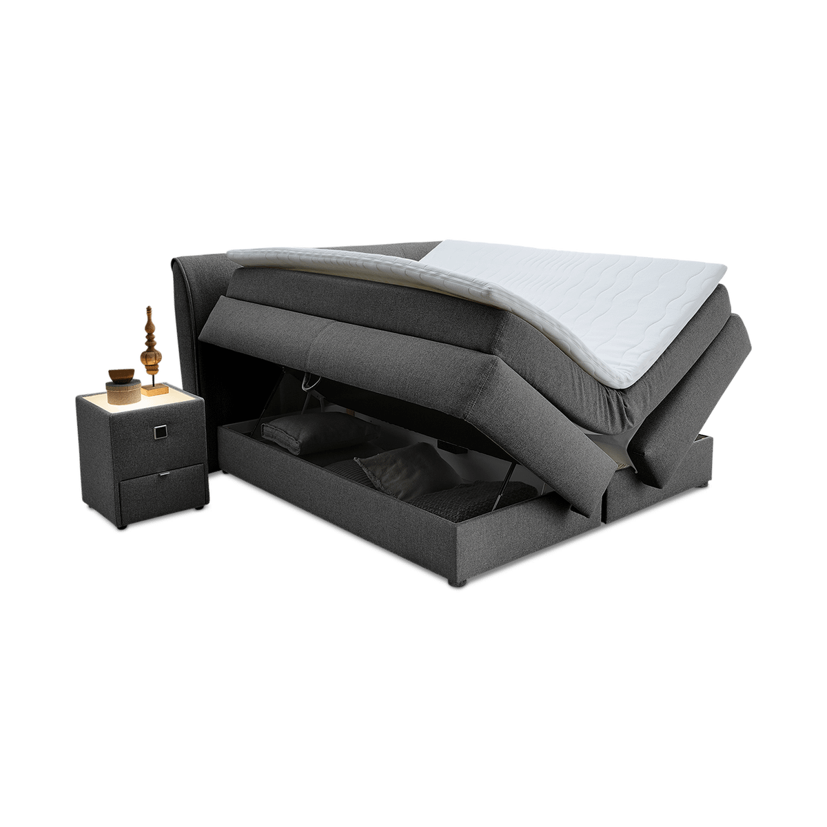 Boxspring AMSTELVEEN brengt rust en comfort samen in één stijlvol ontwerp. De donkergrijze bekleding geeft het bed een moderne uitstraling die makkelijk te combineren is met verschillende slaapkamerstijlen. Met een afmeting van 160x200 cm biedt deze boxspring voldoende ruimte om ontspannen te slapen of languit een serie te kijken. Dankzij de handige opbergruimte aan beide zijden blijft je slaapkamer netjes en overzichtelijk – extra dekens, kussens of beddengoed berg je moeiteloos op. Het licht gebogen hoofdbord zorgt voor een zachte, uitnodigende look die ook nog eens fijn aanvoelt wanneer je rechtop zit. AMSTELVEEN is niet alleen een bed, maar een plek om écht tot rust te komen na een drukke dag.