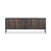 Onze enorm populaire GRAVURE serie heeft een make-over gekregen! Een hip en modulair tv-meubel met grafische reliëf deuren, in essenhout en afgewerkt met een espressokleurige beits en met zwarte, metalen poten.