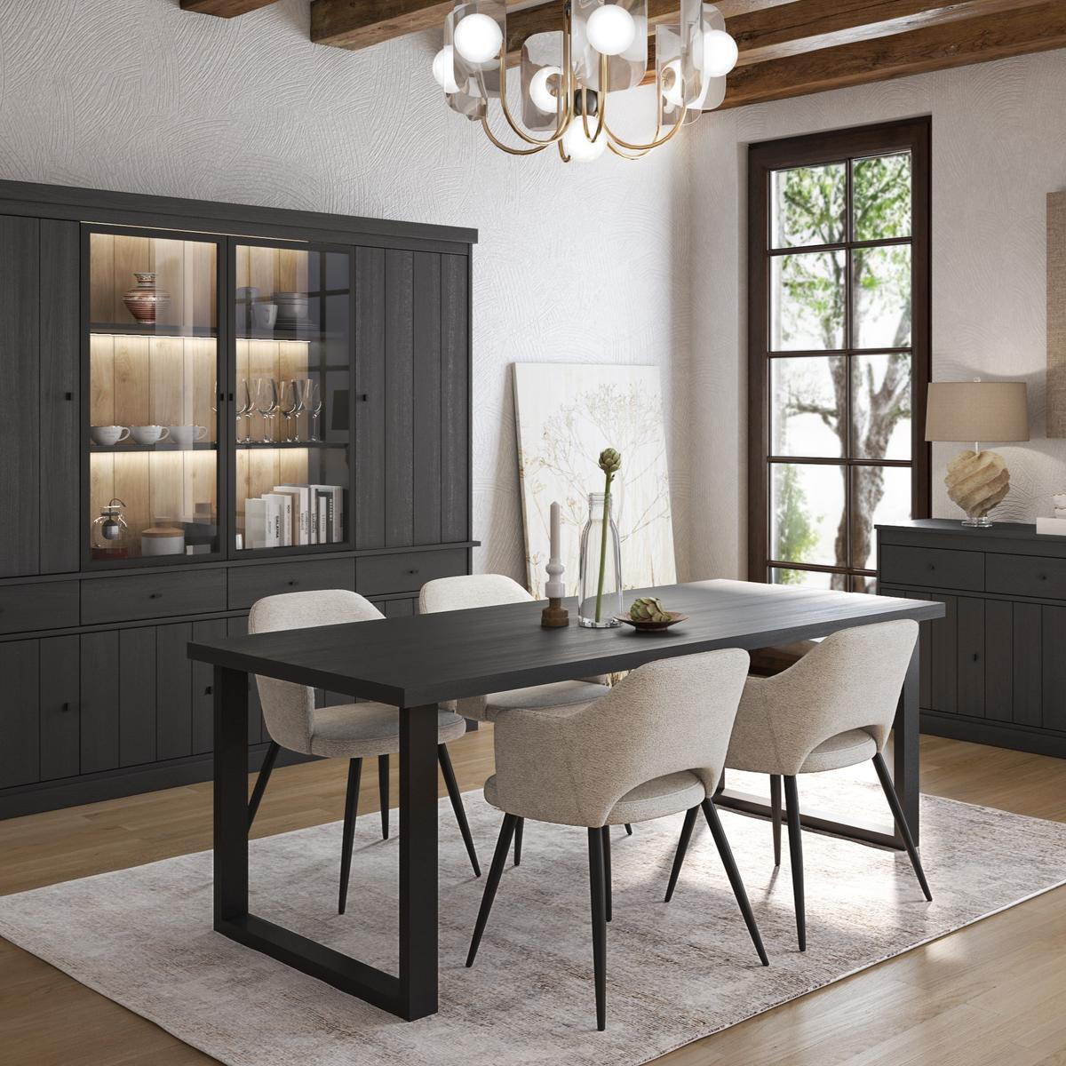 De eettafel CASTELLO is een ware blikvanger in elke eetkamer. Met zijn afmetingen van 180x98 cm biedt deze rechthoekige tafel voldoende ruimte voor gezellige diners met familie en vrienden. Het tafelblad, vervaardigd uit zwarte eik, straalt een stoere en moderne uitstraling uit. De stevige u-poten complementeren het robuuste ontwerp en zorgen voor een stabiele basis. Deze eettafel past perfect bij de andere artikelen uit de Castello collectie, waardoor je moeiteloos een samenhangende en stijlvolle inrichting kunt creëren.