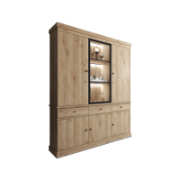Deze vitrinekast beschikt over één glazen deur, vijf volle deuren en drie lades, waardoor je voldoende ruimte hebt om je favoriete decoratieve items tentoon te stellen en andere benodigdheden netjes op te bergen. De optionele LED-verlichting zet je collectie in de schijnwerpers en creëert een warme, uitnodigende sfeer in je huis.