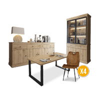 Eetkamer CASTELLO: Dressoir + Vitrinekast + Eettafel 180x98 + 4x Stoelen TOMASO Micro Cognac