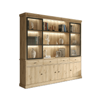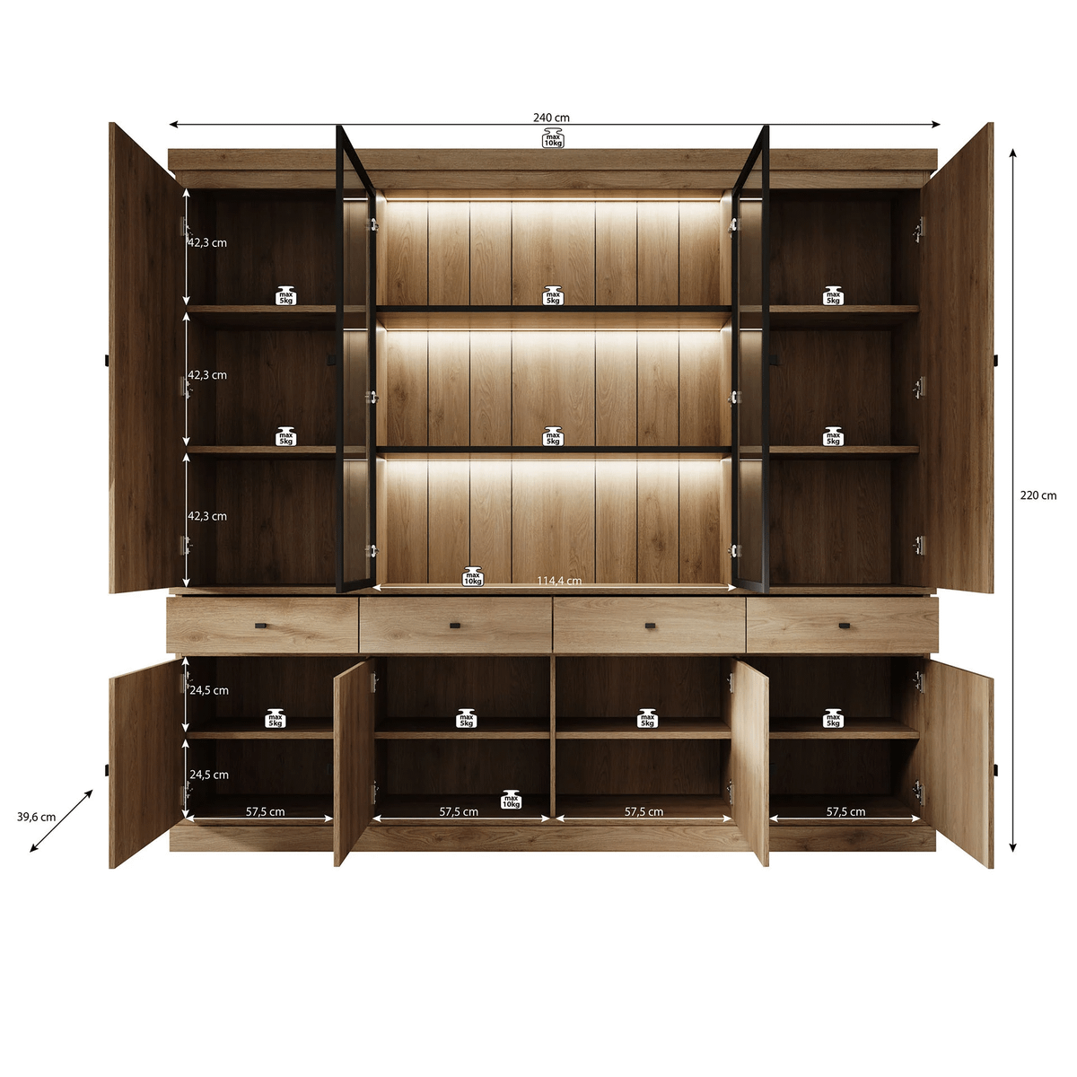 Vitrinekast CASTELLO in warme Lichte Eik is een perfecte combinatie van stijl en functionaliteit. Met 2 elegante glasdeuren, 3 open vakken, 4 ruime deuren en 4 handige laden biedt deze kast volop opbergruimte én een prachtig podium voor je mooiste accessoires. De sfeervolle LED-verlichting en het strakke metalen frame geven de kast een moderne touch, terwijl de natuurlijke houtlook zorgt voor een warme, huiselijke uitstraling. CASTELLO is de ideale eyecatcher voor elke woonkamer of eetruimte.