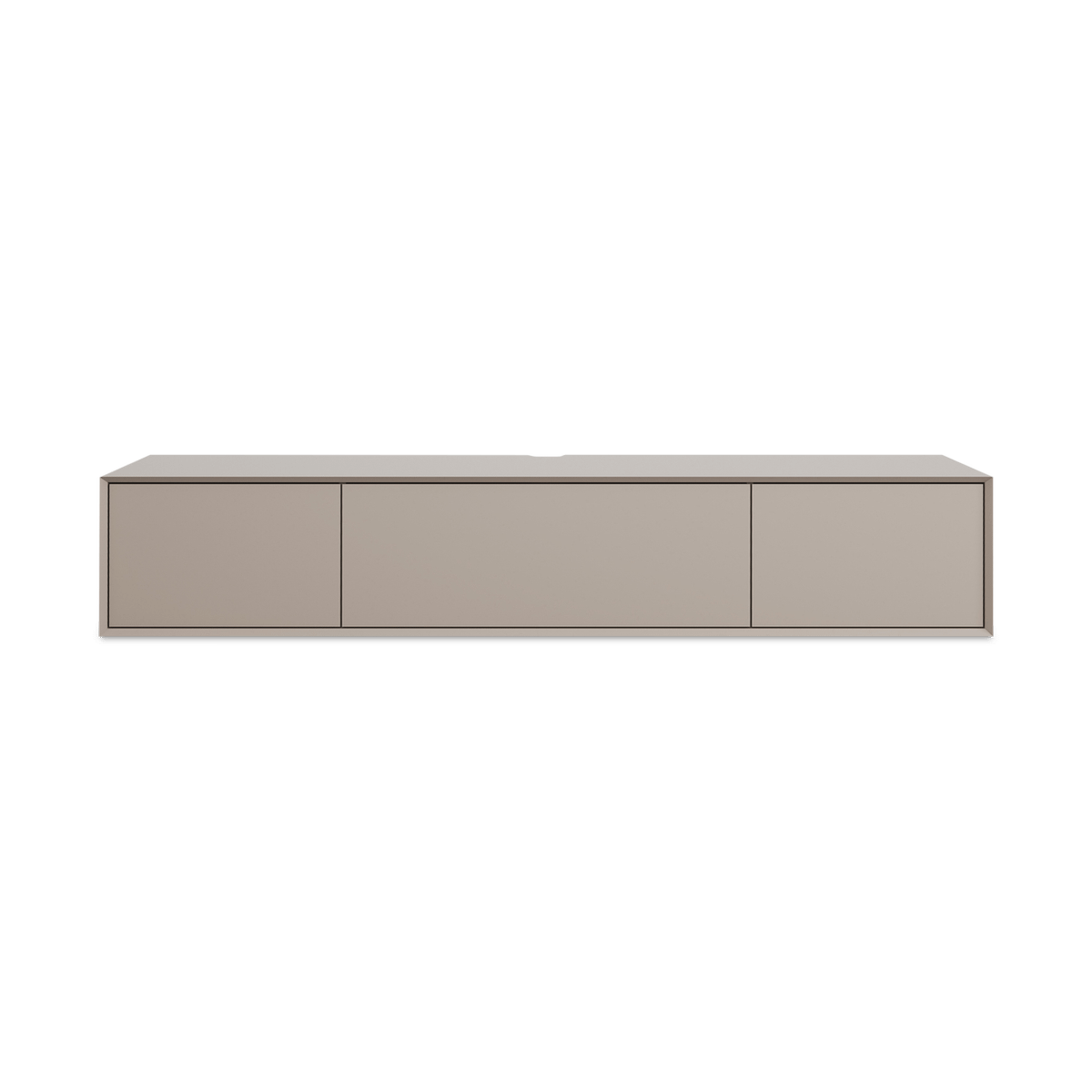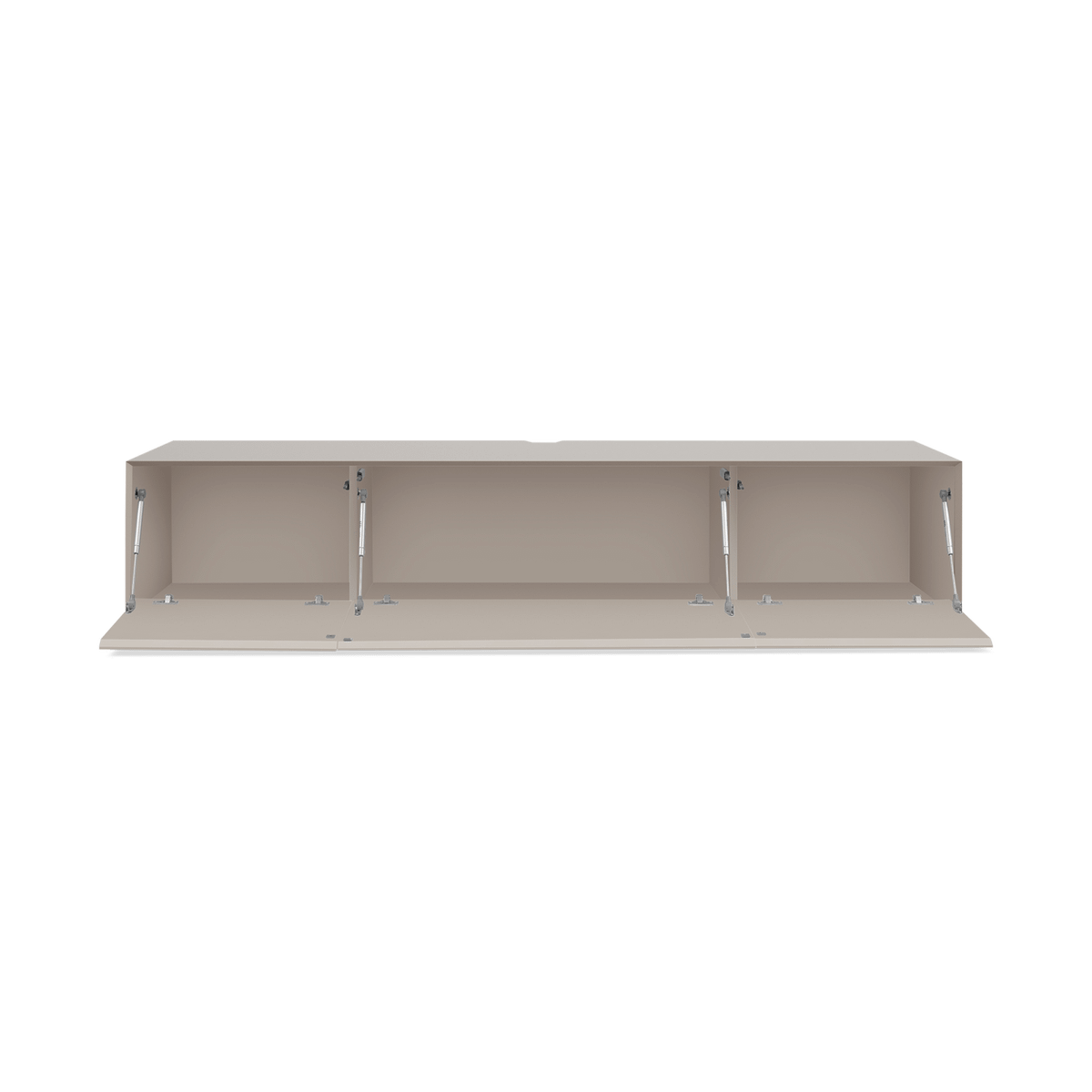 Dankzij de praktische klapdeuren biedt het meubel voldoende opbergruimte voor multimedia-apparatuur of accessoires, terwijl de zwevende montage zorgt voor een luchtig en elegant geheel.