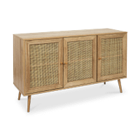 Ontdek het dressoir CANNA, met drie deuren en kenmerkende rotan fronten. Gemaakt van hout en voorzien van prachtige rotan fronten, voegt het Canna dressoir een vleugje organische charme toe aan elke ruimte. Met drie ruime deuren biedt dit dressoir voldoende opbergruimte voor al je essentials, terwijl het unieke ontwerp een onderscheidende esthetiek toevoegt aan je interieur.