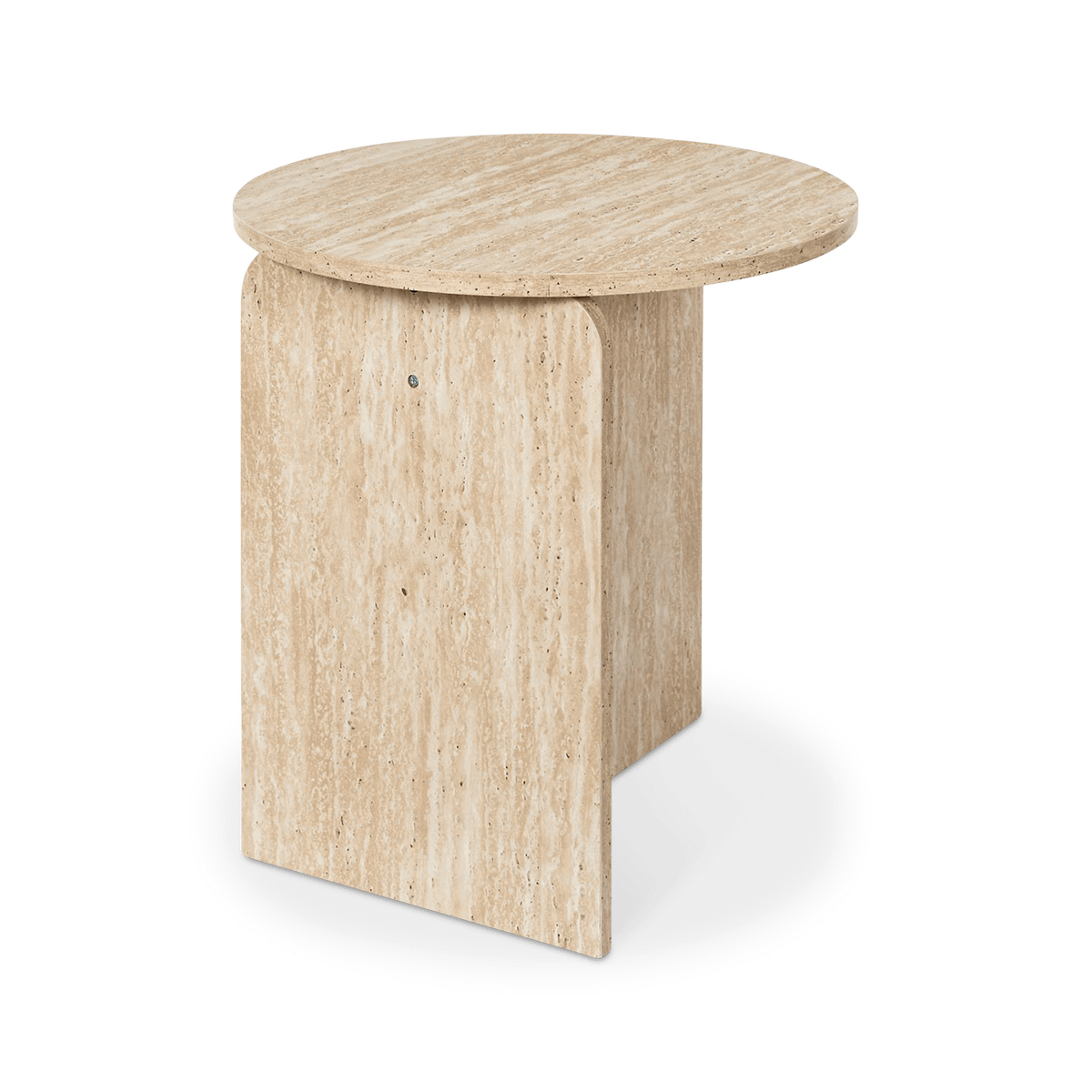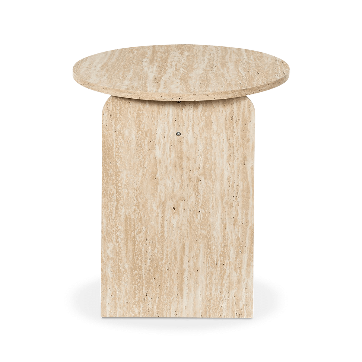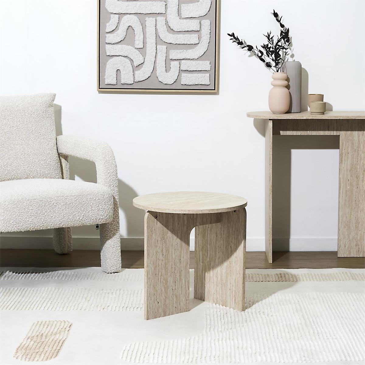 De elegante travertijnlook en zachte, afgeronde vormen zorgen voor een rustige en verfijnde uitstraling. Het compacte formaat maakt deze tafel ideaal als praktische aanvulling naast je zetel of fauteuil, zonder in te boeten op stijl.