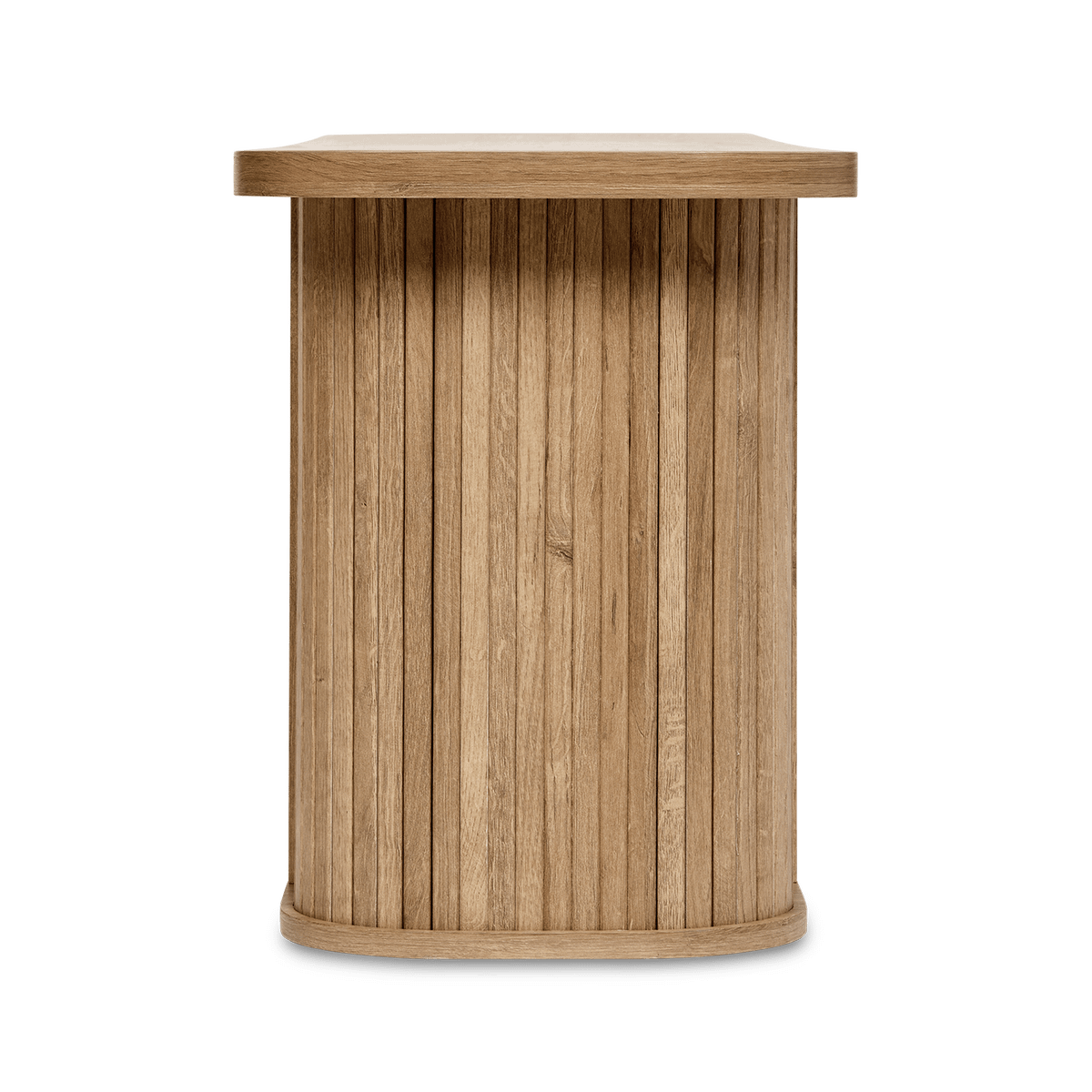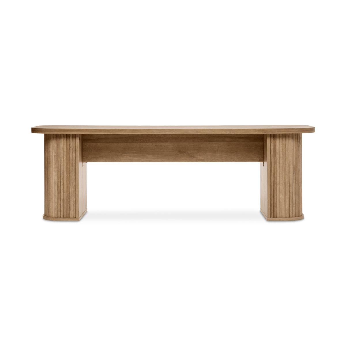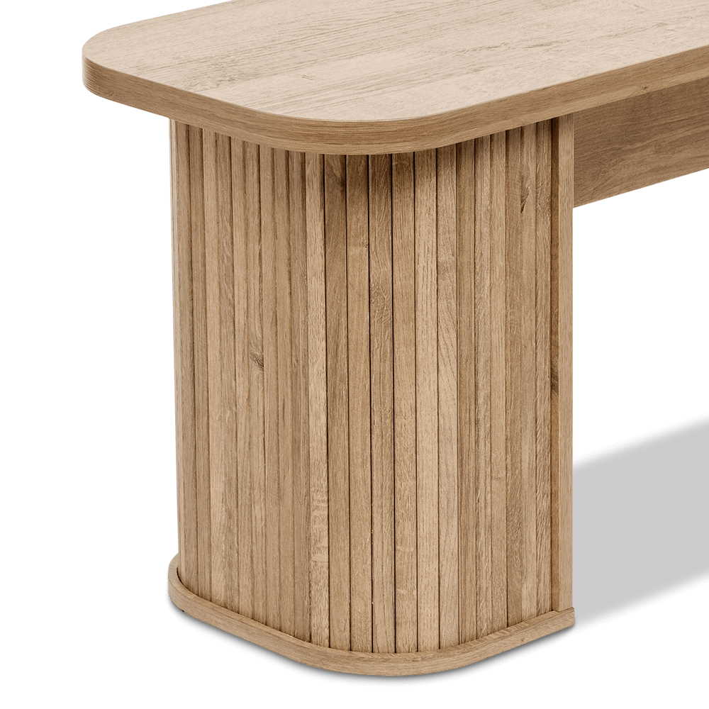 De afgeronde hoeken en verticale reliëfafwerking aan de poten geven het ontwerp een verfijnde, moderne uitstraling. Met een breedte van 140 cm biedt deze bank voldoende plaats om te zitten of decoratief te gebruiken met kussens of een plaid. COLVAS combineert warme houttinten met een strak lijnenspel – stijlvol, functioneel en makkelijk te combineren met diverse interieurstijlen.