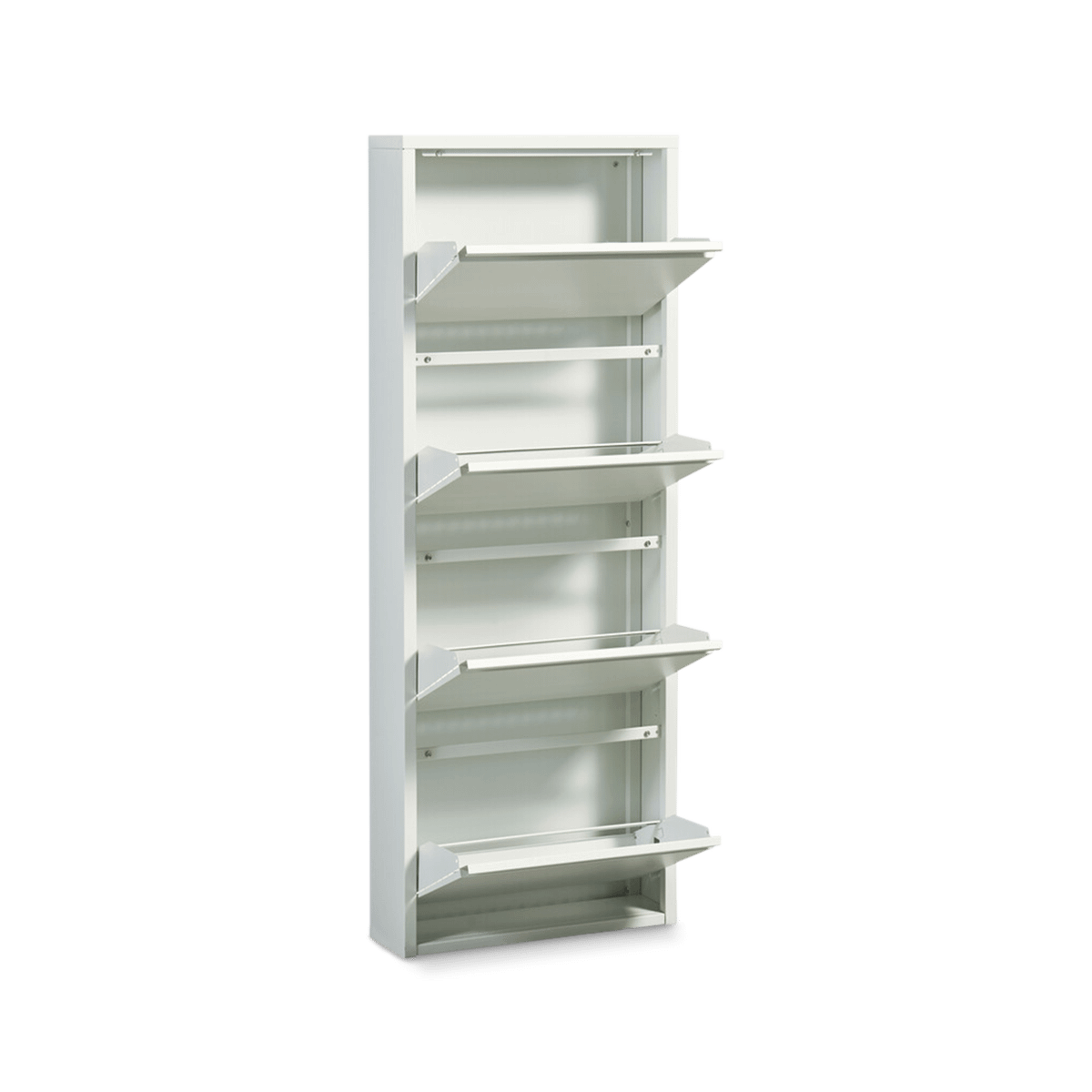 Schoenenkast GITTE in Wit combineert een strak design met maximale functionaliteit en is de perfecte oplossing voor een georganiseerde hal of slaapkamer. Dankzij de smalle en hoge vormgeving neemt deze schoenenkast weinig plaats in, terwijl je toch verrassend veel schoenen netjes kunt opbergen achter de vier kleppen. De witte afwerking zorgt voor een tijdloze, moderne uitstraling die past in zowel een minimalistisch als een klassiek interieur. Bovendien houdt de gesloten opbergstructuur je schoenen stofvrij en creëer je meteen een opgeruimde en stijlvolle indruk bij binnenkomst. Ideaal voor wie praktisch wonen wil combineren met een frisse, elegante look.