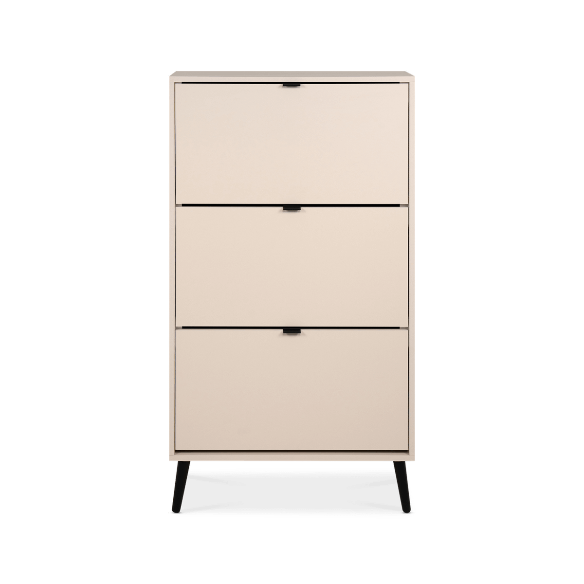 Schoenenkast MADDIE in Cappuccino kleur met zwarte pootjes combineert strak design met praktische opbergruimte. Dankzij de drie klepvakken biedt deze schoenenkast volop plaats voor jouw favoriete schoenen, terwijl het compacte formaat perfect is voor hal, slaapkamer of garderobe. De elegante cappuccinokleur geeft een warme, moderne uitstraling en de slanke zwarte pootjes zorgen voor een luchtig, stijlvol effect. MADDIE is een ideale oplossing voor wie schoenen netjes wil opbergen zonder concessies te doen aan interieurstijl – functioneel, ruimtebesparend en eigentijds!