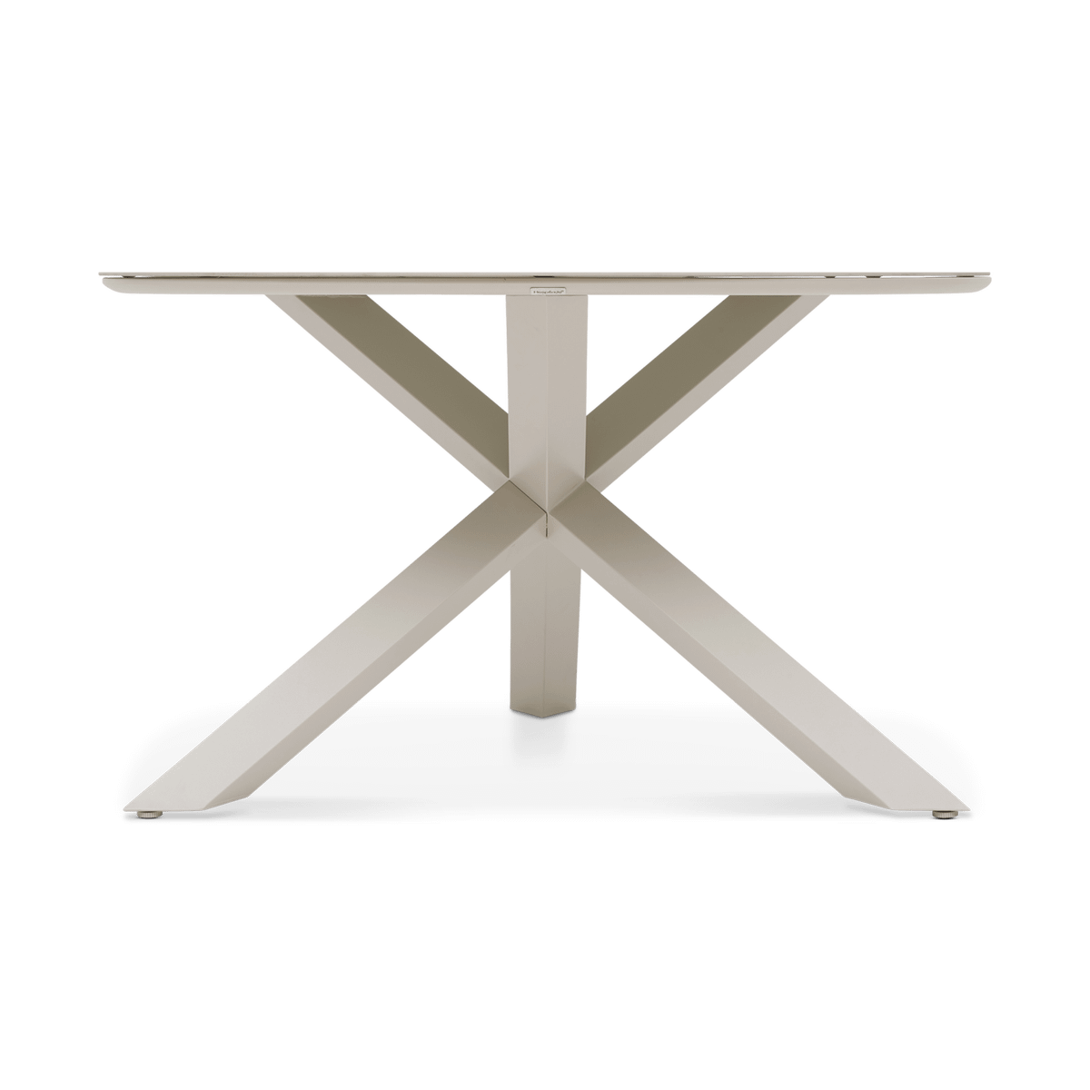 Het strakke kruisframe zorgt voor een stabiele basis en een moderne uitstraling. Dankzij het weerbestendige materiaal is de tafel bestand tegen zon, regen en temperatuurschommelingen, waardoor ze ideaal is voor buitengebruik het hele jaar door.