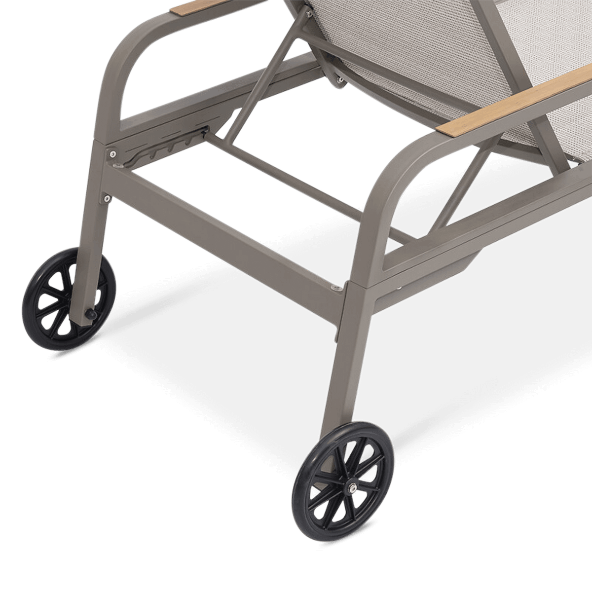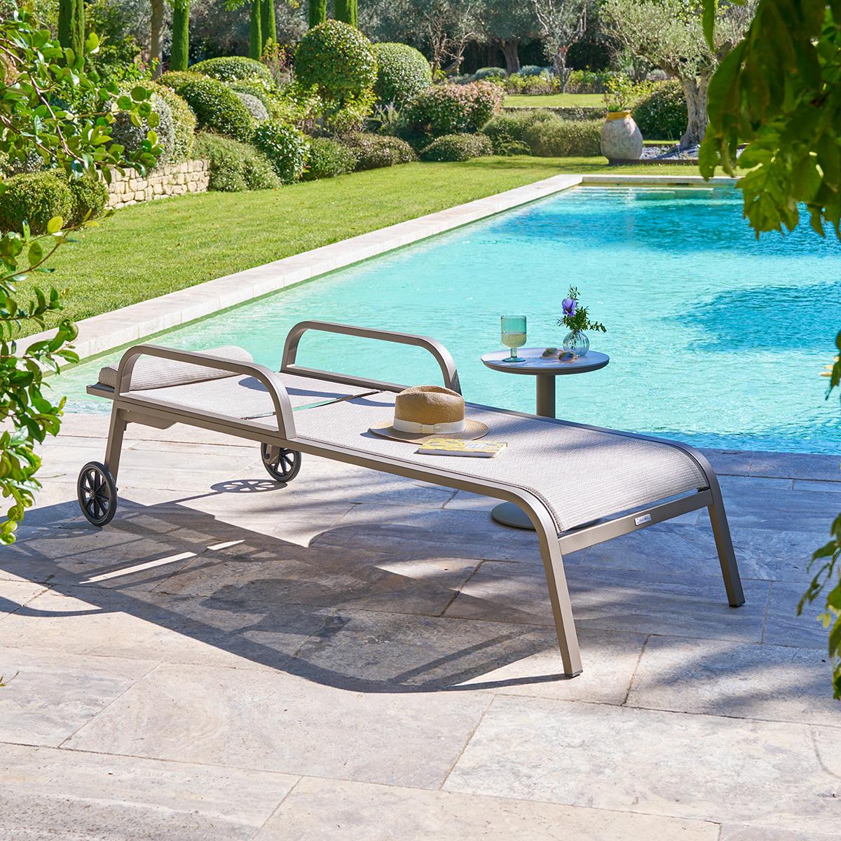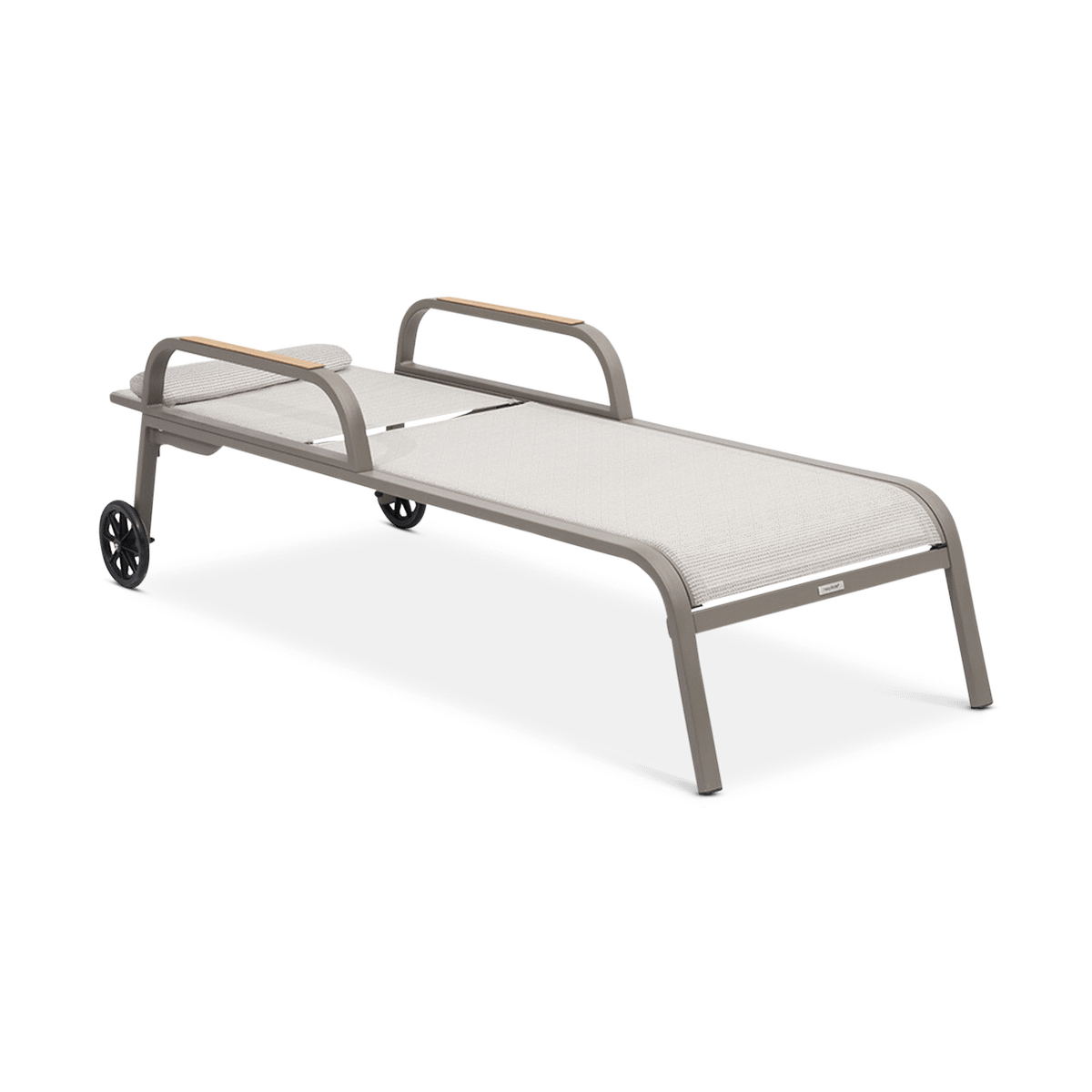 Het lichte aluminium frame in Koffiekleur geeft een verfijnde en rustgevende uitstraling, terwijl het Beige textileen ligvlak zacht aanvoelt en snel droogt. De grote wielen maken het ligbed eenvoudig verplaatsbaar.