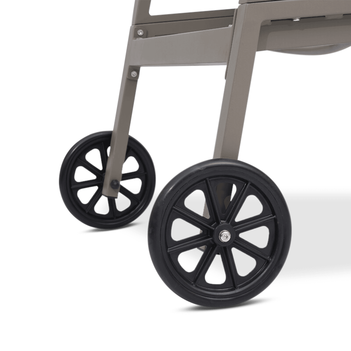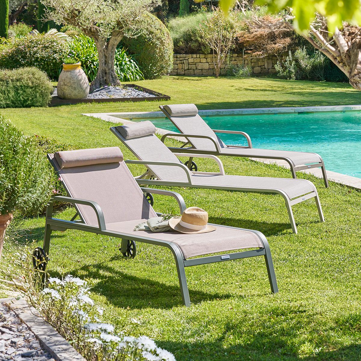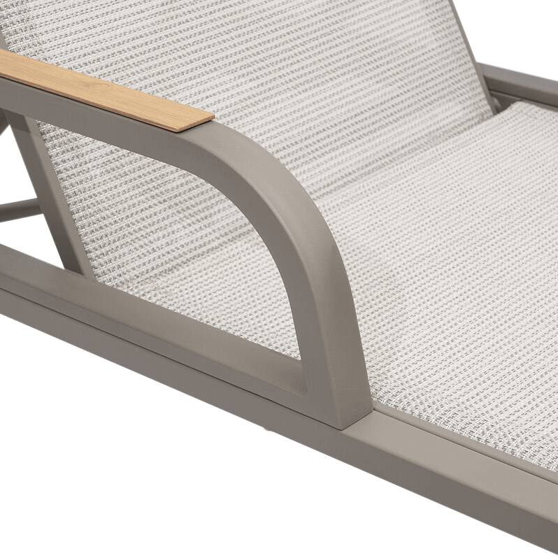 Het lichte aluminium frame in Koffiekleur geeft een verfijnde en rustgevende uitstraling, terwijl het Beige textileen ligvlak zacht aanvoelt en snel droogt. De grote wielen maken het ligbed eenvoudig verplaatsbaar.